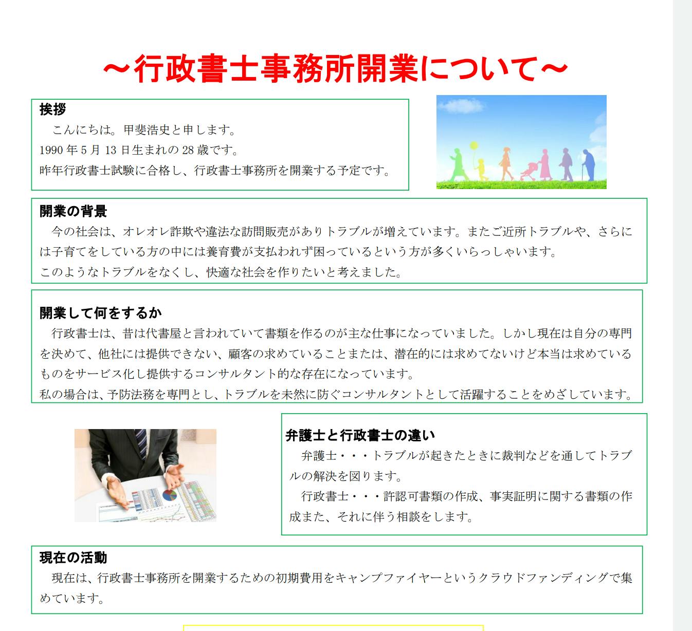 宮崎市出身の甲斐浩史です。昨年、行政書士の資格を取り、今年の9月に開業をする予定です。よろしくお願いします。