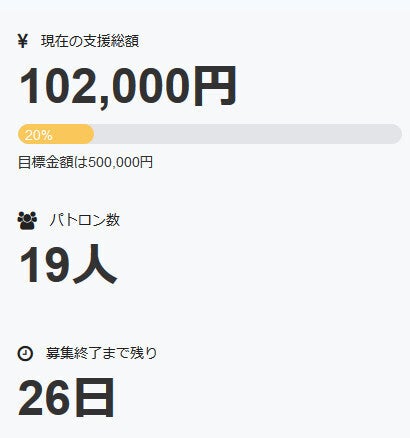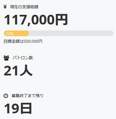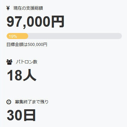 お世話になっております。 名無しの東北県人です。 本日、新たに一名の方がパトロンとなって下さいました。 深く御礼申し上げます。 現在の調達率は19%となっております。 本当にありがとうございます。 引き続き、何卒宜しくお願い致します。