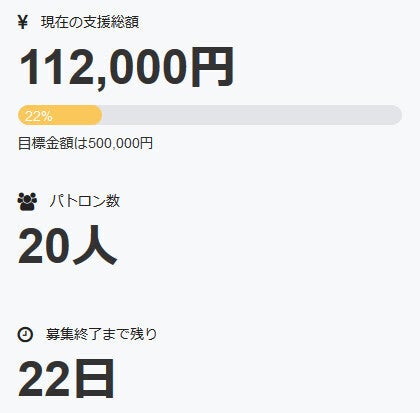 お世話になっております。 名無しの東北県人です。 昨晩、更に一名の方がパトロンとなって下さいました。 深く御礼申し上げます。 現在の調達率は22%となっております。 本当にありがとうございます。 引き続き、何卒宜しくお願い致します。
