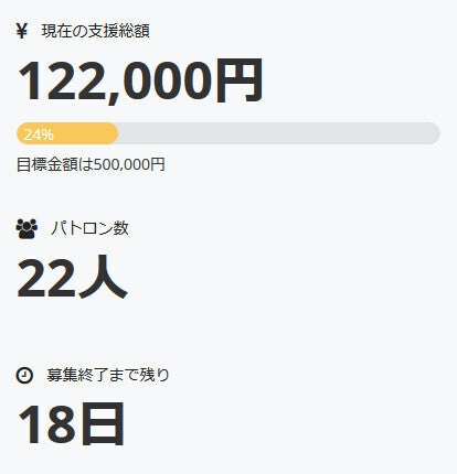 お世話になっております。 名無しの東北県人です。 本日、また新たに一名の方がパトロンとなって下さいました。 深く御礼申し上げます。 現在の調達率は24%となっております。 本当にありがとうございます。 引き続き、何卒宜しくお願い致します。