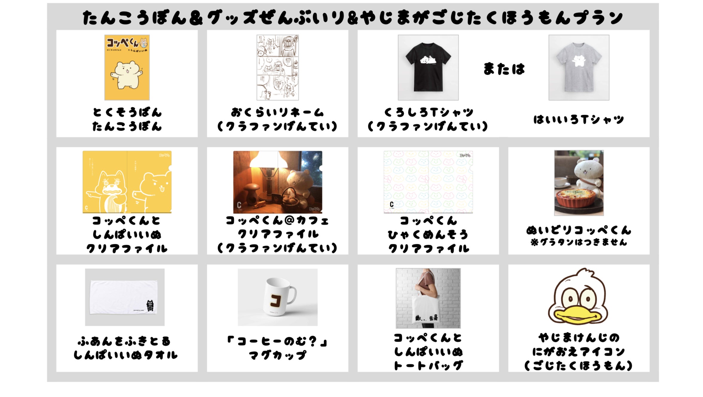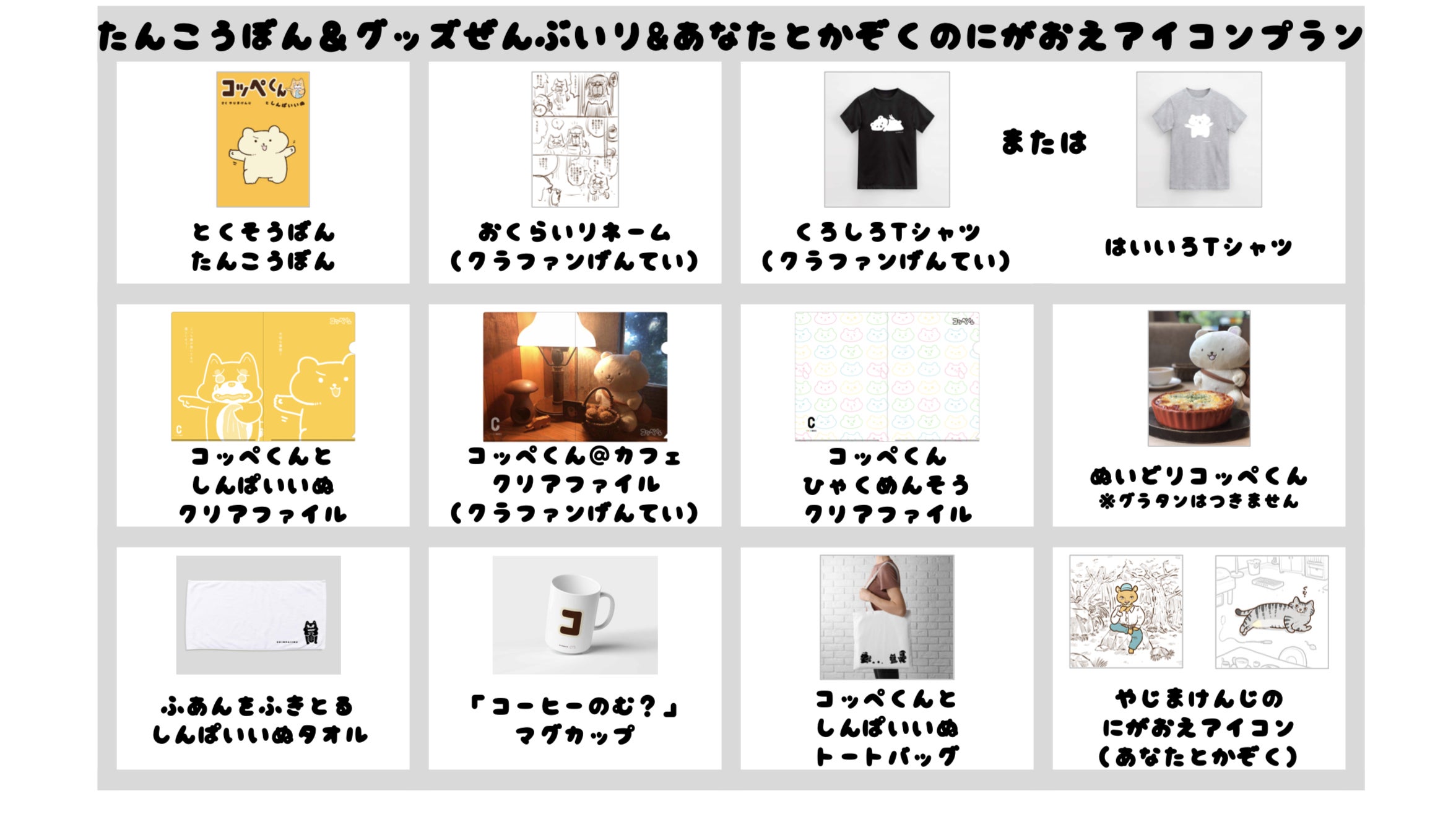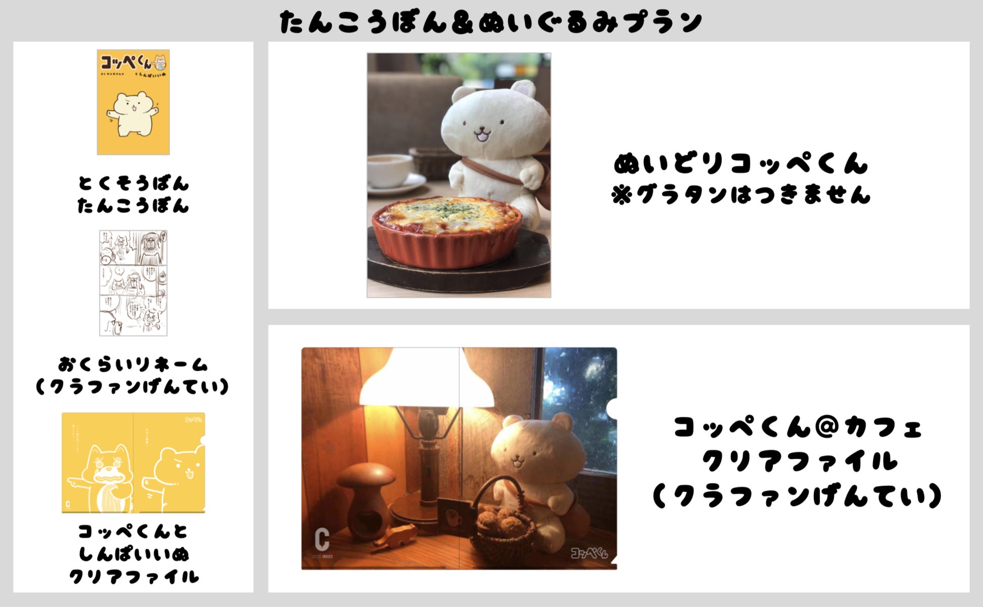 「たんこうぼんプラン」に、コッペくんを忠実に再現した「ぬいどりコッペくん」、前田デザイン室の前田さんがデザインしてくださったカフェにたたずむコッペくんがかわいい「コッペくん@カフェクリアファイル」を追加したプランです!