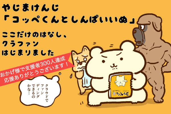 僕の活動を応援してくれているコッぺ、しんぱいいぬファンのみなさんと一緒に、「コッぺくんとしんぱいいぬ」の単行本化を盛り上がりたいと思い、クラウドファンディングに挑戦することにしました。お祭り感覚でご支援いただけるととっても嬉しいです。よろしくお願いします!