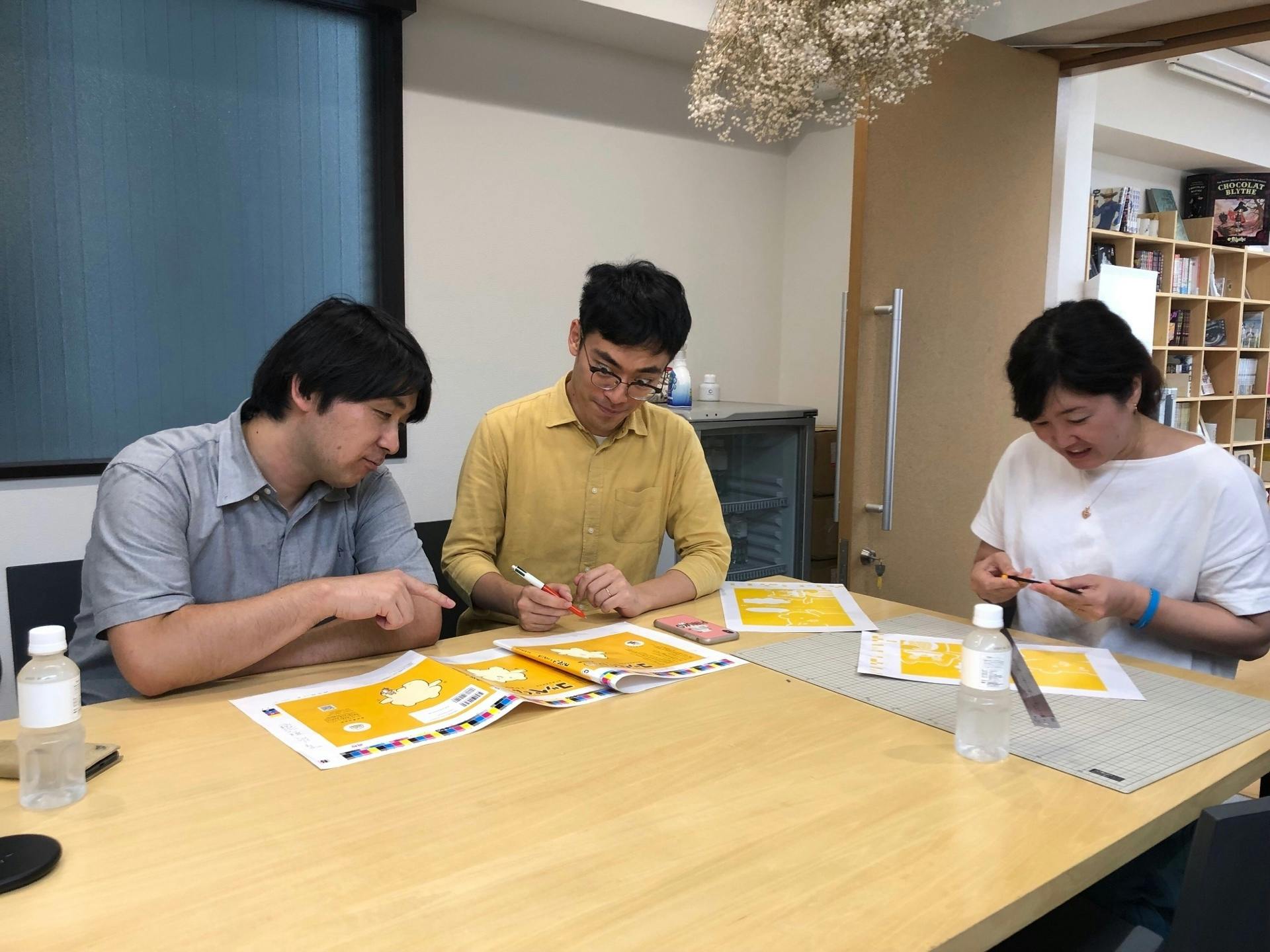 写真はカバーをデザインしてくださった前田デザイン室の前田さんと、コルクの写植職人の中谷さんと単行本の表紙について話し合っている所です。