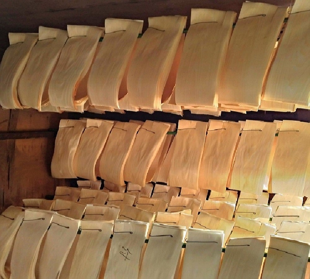 古川さんが製作する経木は、普通のもので厚さ0.25ミリ、特殊なものは厚さ0.13ミリ。(これがギリギリの薄さだそうです)使用している樹種はシナノキ(マダノキとも言います)このシナノキの特徴は、香りがほとんどないこと。食品と接する商品を作るには、最高の材料です。経木を扱うコツ、使う接着剤、包装のこと、売り方…初めてお目にかかったのに、話は途切れることなく続きました。