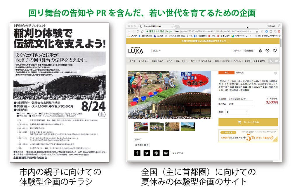 また回り舞台の準備を手伝ってくださる方も募集しております。そのボランティアの方々の昼食用のお米を、使わなくなった田んぼを使って作っています。その米づくりをお手伝いいただく方も募集しています。詳しくは下記画像をご覧ください。