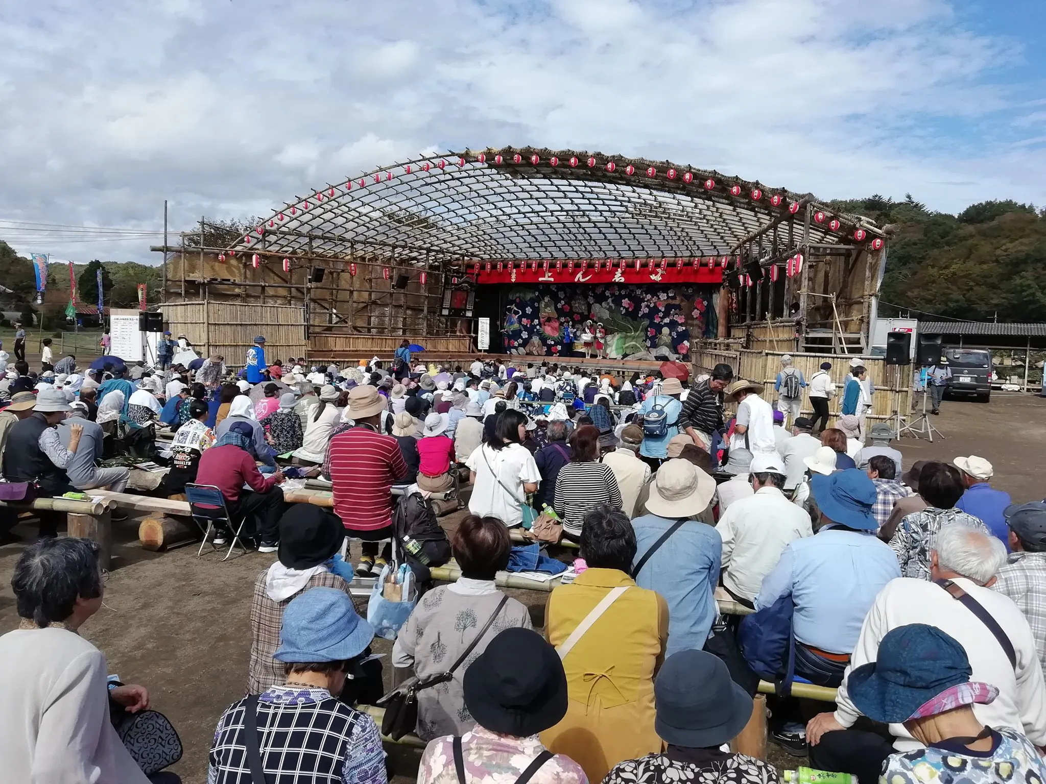 回り舞台保存会とボランティアの方々で、およそ一ヶ月をかけて舞台を組み立て、例年約3000〜5000人の観客が見に来て下さいます。