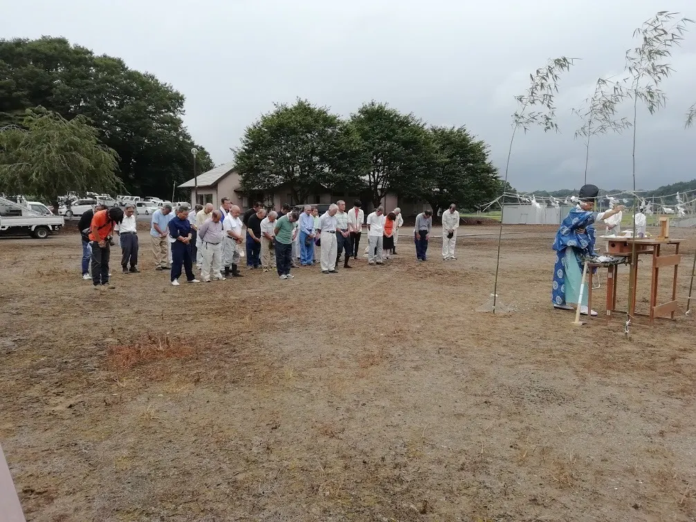 本日は地鎮祭でした。保存会の方々、ボランティア、茨城大学、地域おこし協力隊、市役所、メディアの方々にご参列いただき、組立ての安全と公演の成功を祈りました。終了後いよいよ組立て開始。3月に皮をむいた杉の丸太が、組立てられて柱や梁になっていきます。実に壮観。このあと10/19の公演までほぼ毎日組立て作業が続きます。本番公演ももちろんですが、少しずつ組み上がって行く回り舞台をぜひ見学にいらしてください。組立て等のボランティアも引き続き募集中です。