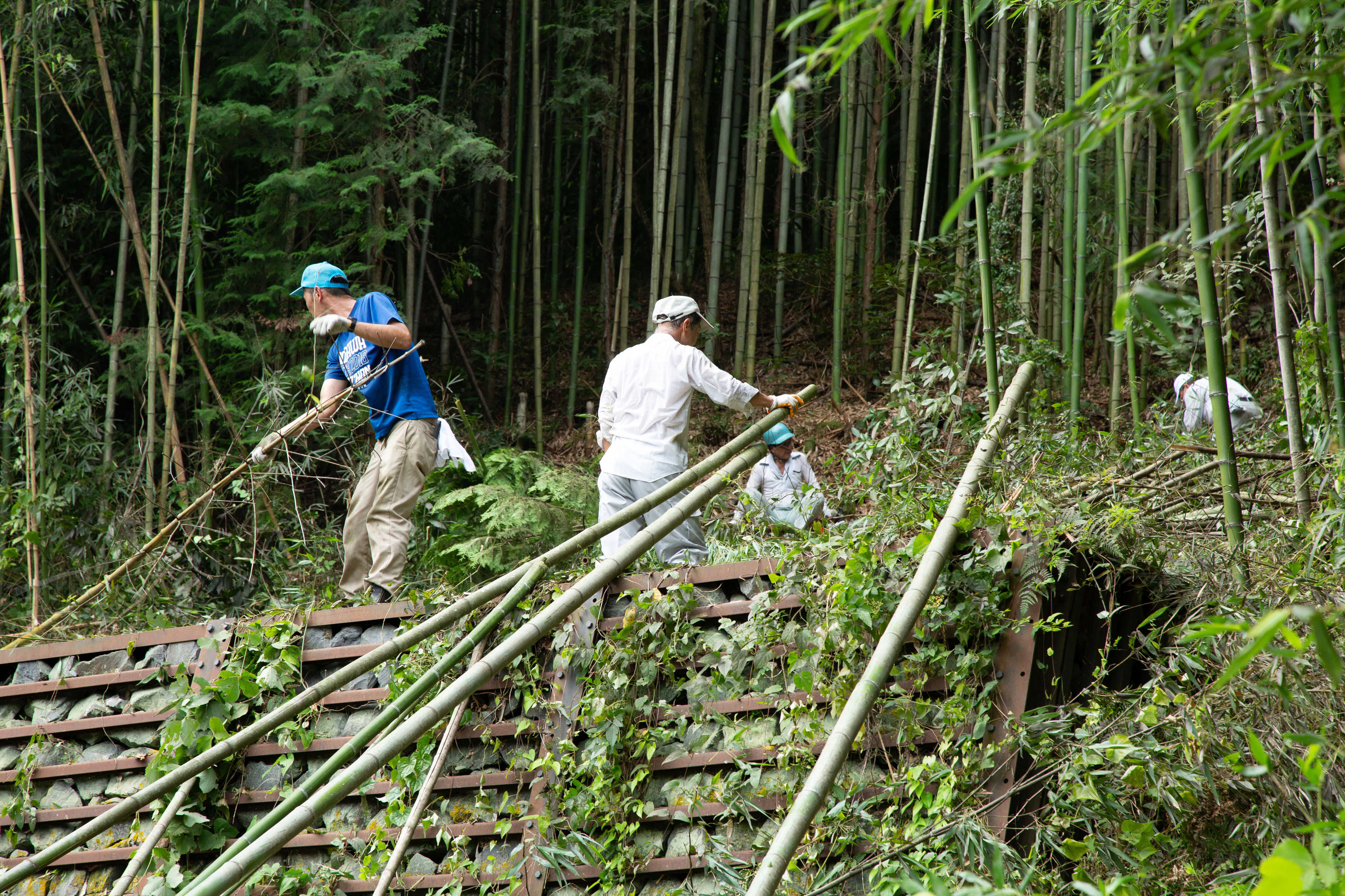 8/31(土)は組立てに使う竹の切り出しをしました。屋根を井桁に組む材料や側面の補強、壁の化粧等、竹は様々な用途に使われます。地区内の合計4カ所の山に入り、保存会、ボランティアで総計約50名で切出しました。おかげさまで約300本の長くて太い立派な青竹をそろえる事ができました。これは組立ての中で一番ハードな作業の一つです。