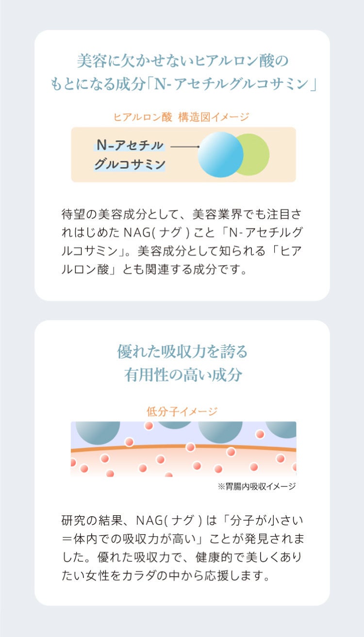 それは「N-アセチルグルコサミン」が美しく健康的な毎日を助ける、ヒアルロン酸の"元"になる成分だから。