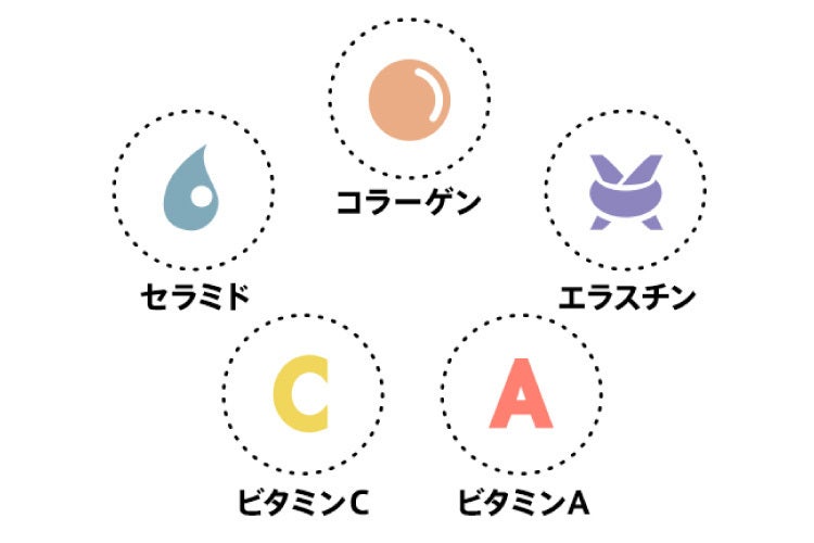 いま注目の美容成分「N-アセチルグルコサミン」をはじめ、潤いあふれる毎日をしっかりサポートする「セラミド」や「コラーゲン」などの厳選美容成分、そして健康的な美しさを応援する「ビタミン類」など、普段の食事だけでは十分な補給が難しい重要な成分をしっかりと配合しております。