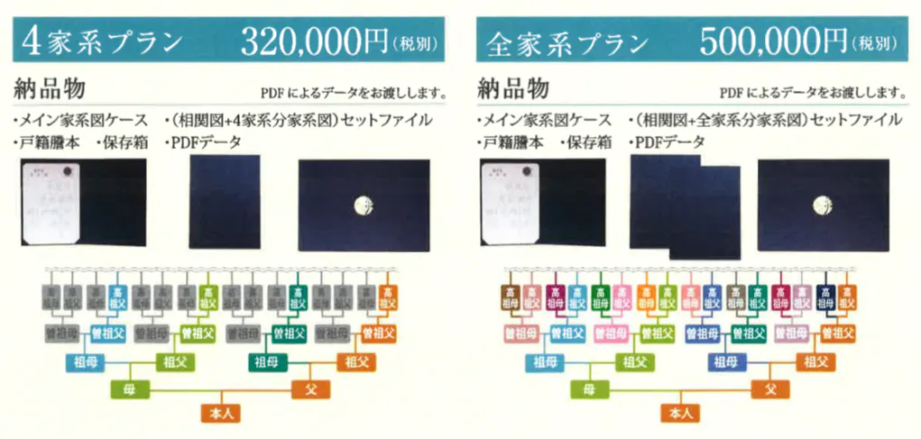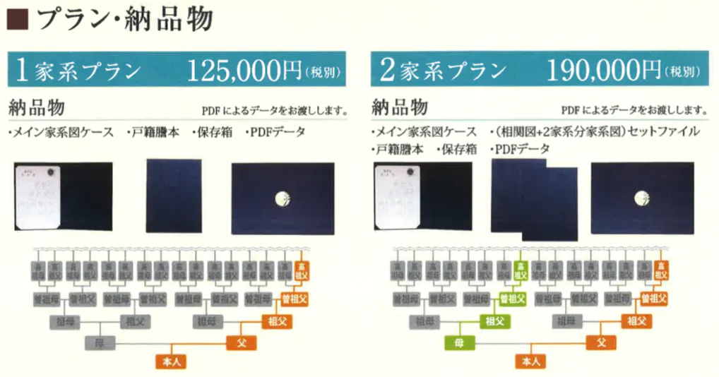 どのプランにおきましても特典は、ご依頼者様の姓の家系図の1家系分のみとなります。