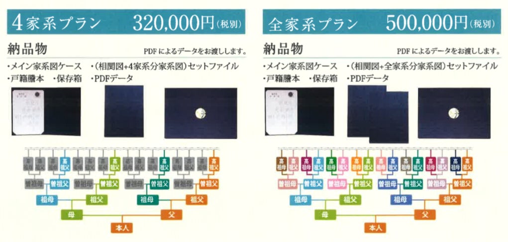 どのプランにおきましても特典は、ご依頼者様の姓の家系図の1家系分のみとなります。