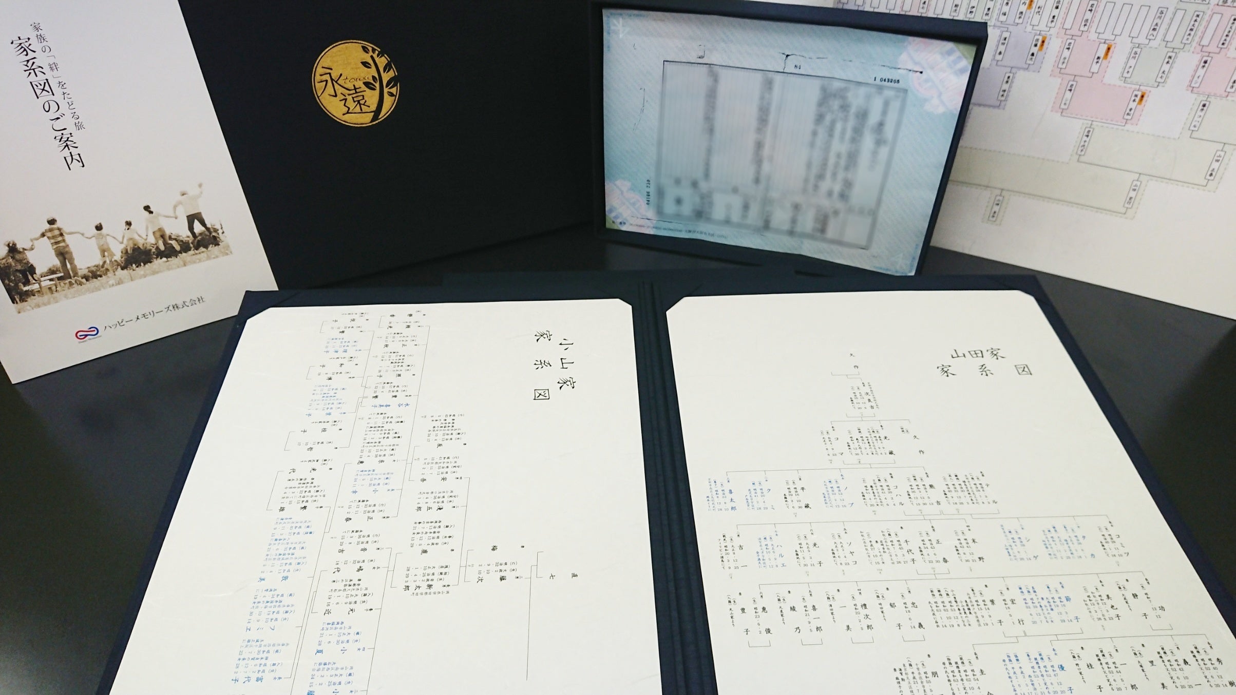 ハッピーメモリーズ株式会社は家系図代行作成サービスを展開する会社です。戸籍謄本の取得から家系図作成まで弊社が代行して完成させます。出来上がった家系図を手に取れば、自分のルーツである家族に心より感謝や絆を実感できるはずです。その気持ちを代々継承し、あたたかく幸せな家族が増えていくことを願っています。今回のプロジェクトは、このような願いを込めた「永遠(とわ)家系図」をお届けするために立ち上げました。