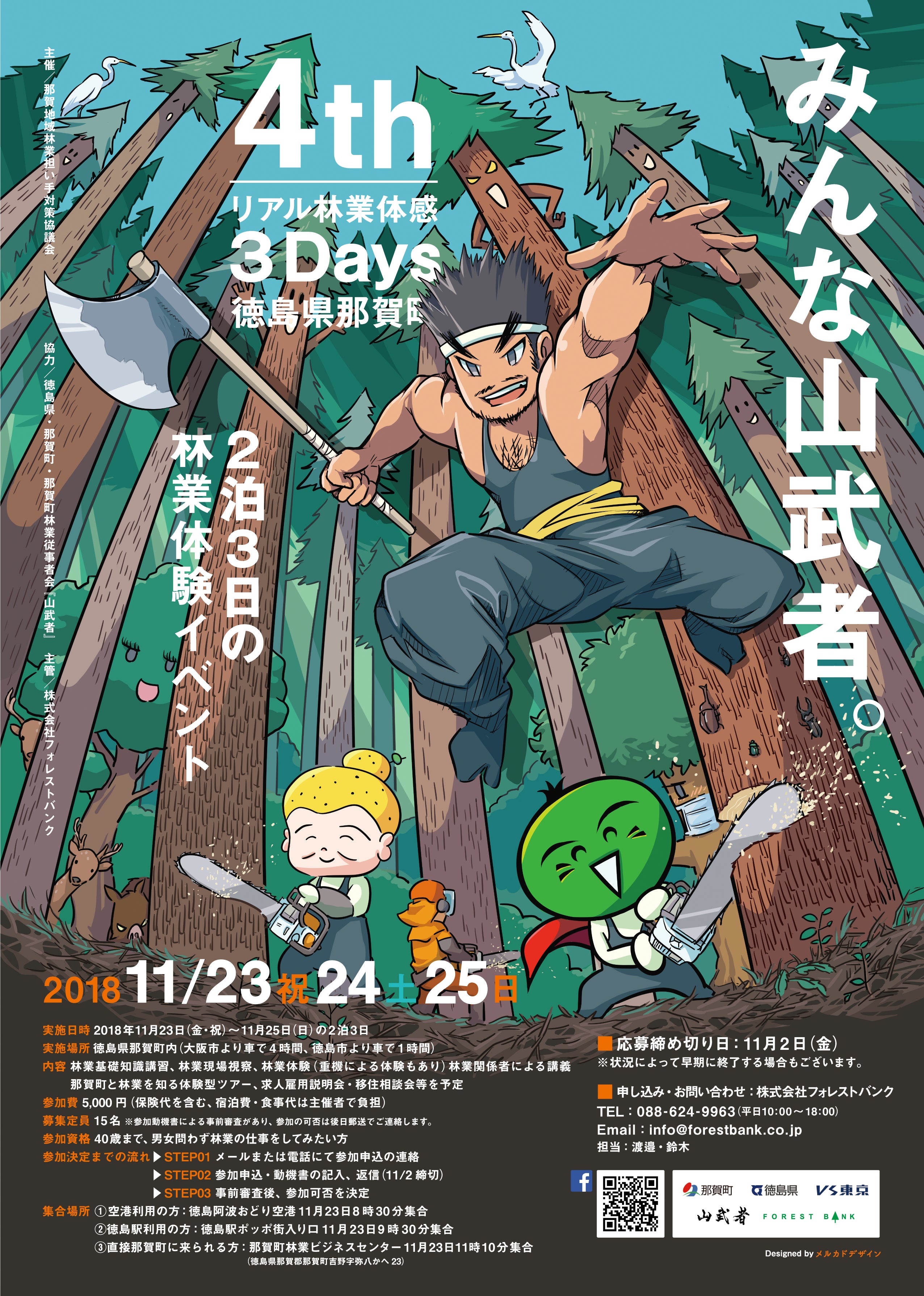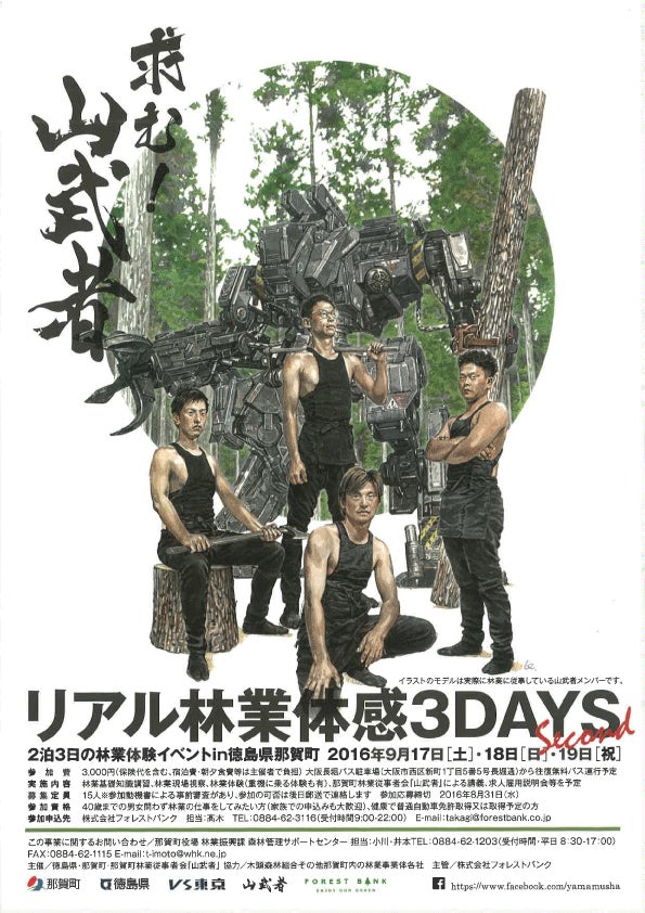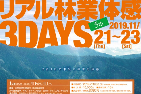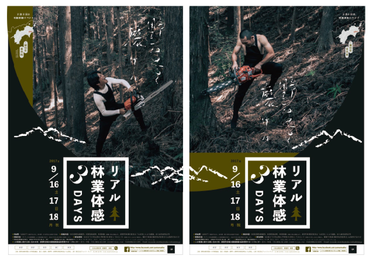 今年のリアル林業体感3DAYSポスター。原点回帰ということで、“リアル”を追求し、林業従事者が撮影した実際の林業現場視察写真を採用。