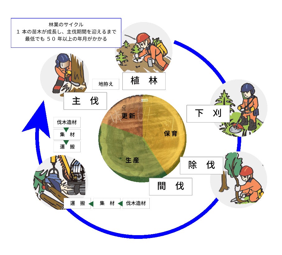 林業の仕事は、山に木の子どもである「苗木」を植え、その木を50~60年という期間、除伐(※1)や間伐(※2)を行い、大切に世話をしながら育てます。