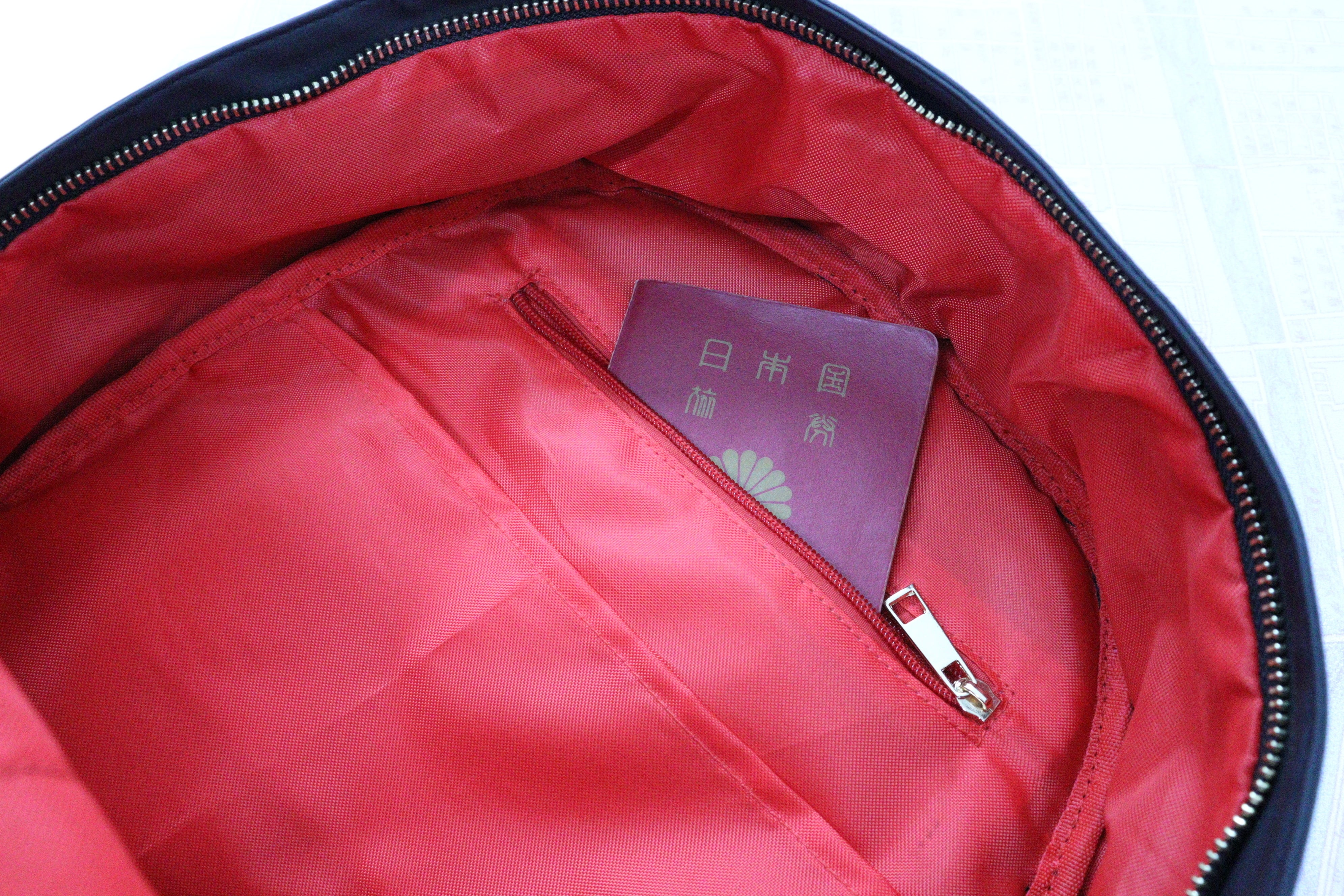 ここにはファスナーがついているので、大切なパスポート、お財布、カードケースなどを入れるのに適しています。