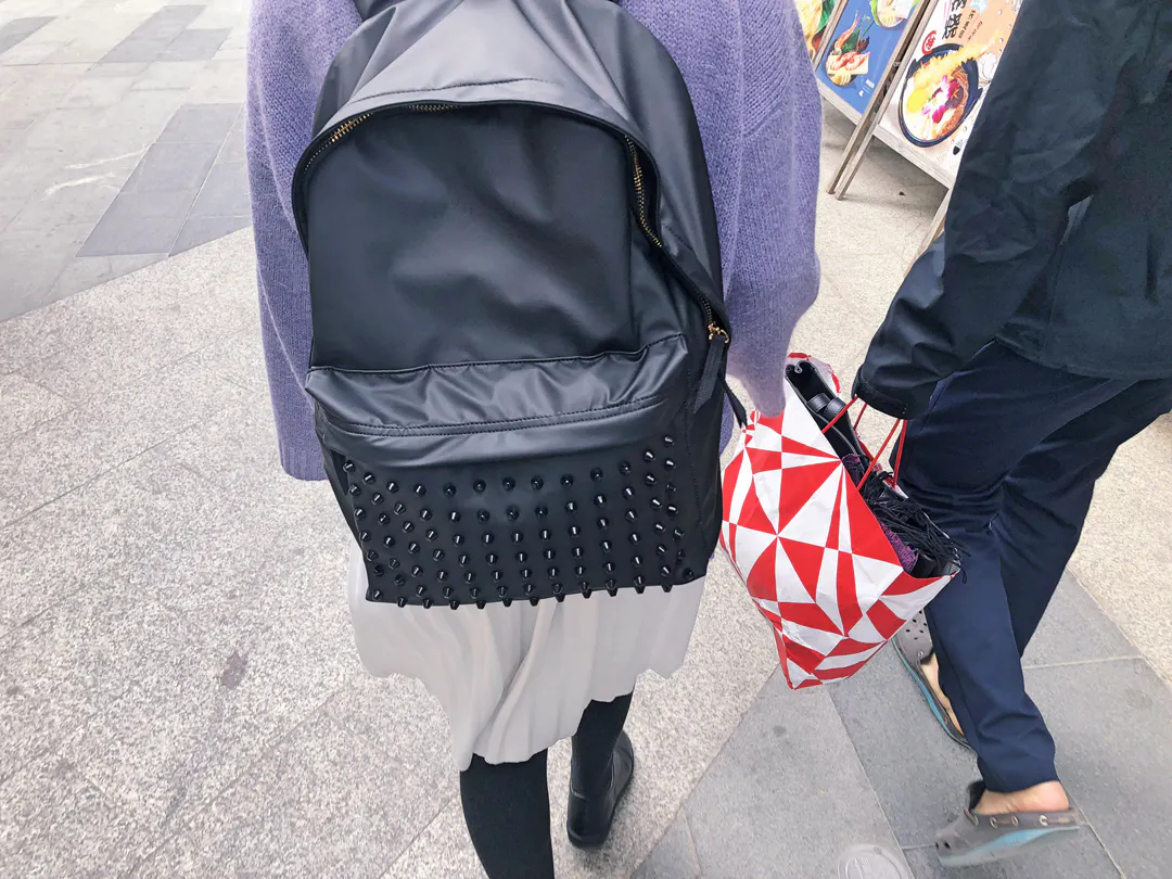 「こんなスタッズ付きの派手なバッグ絶対買わないな」