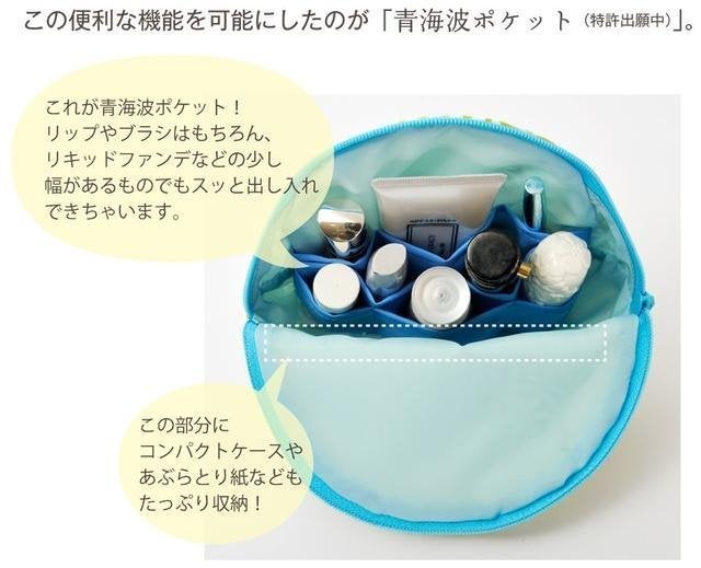 もともと化粧ポーチは横型のタイプが多いため、お目当ての化粧品を探すのに、ガチャガチャと他の化粧品をよけながら探していました。その不便さを解消するために考えられたのが縦型収納。sussuブランドには「青海波ポケット」という互い違いにものを収納できる特別なポケットを採用しました。このポケットがまるで私はここよ、と言っているように、きれいに整理整頓してくれます。