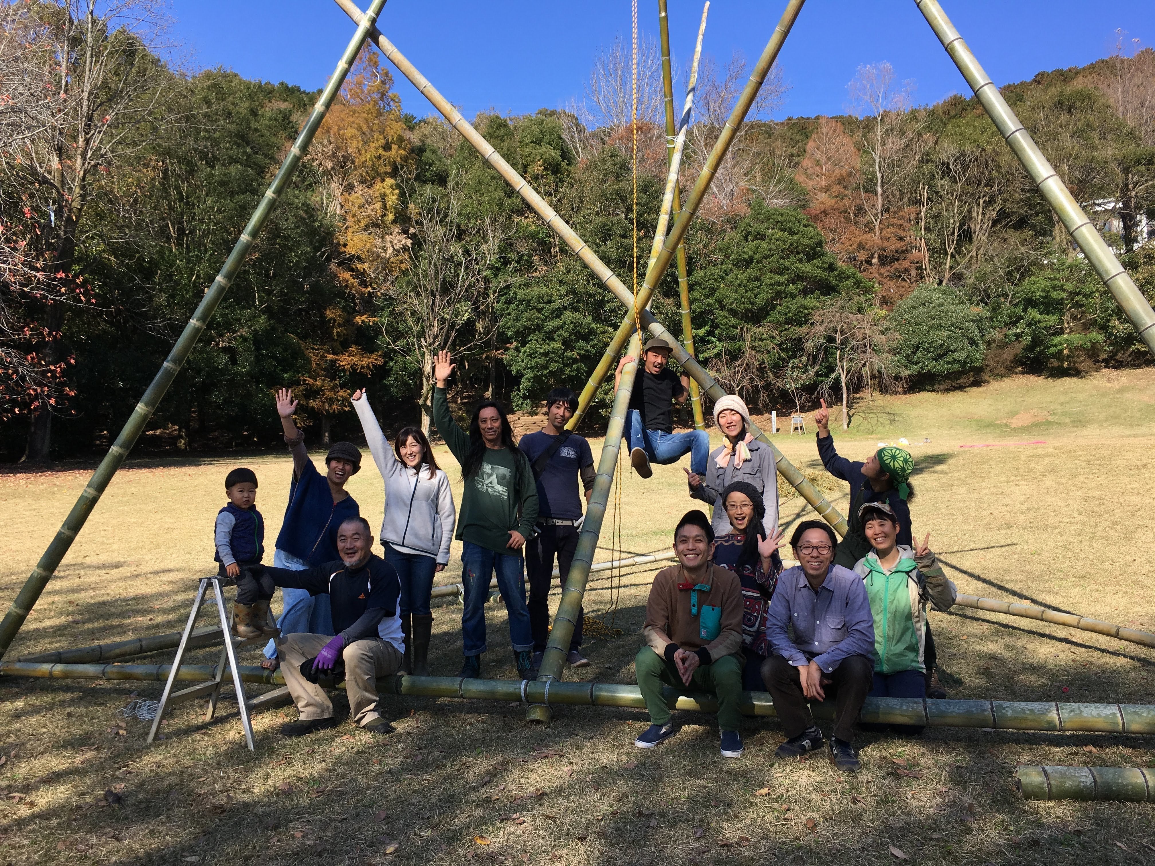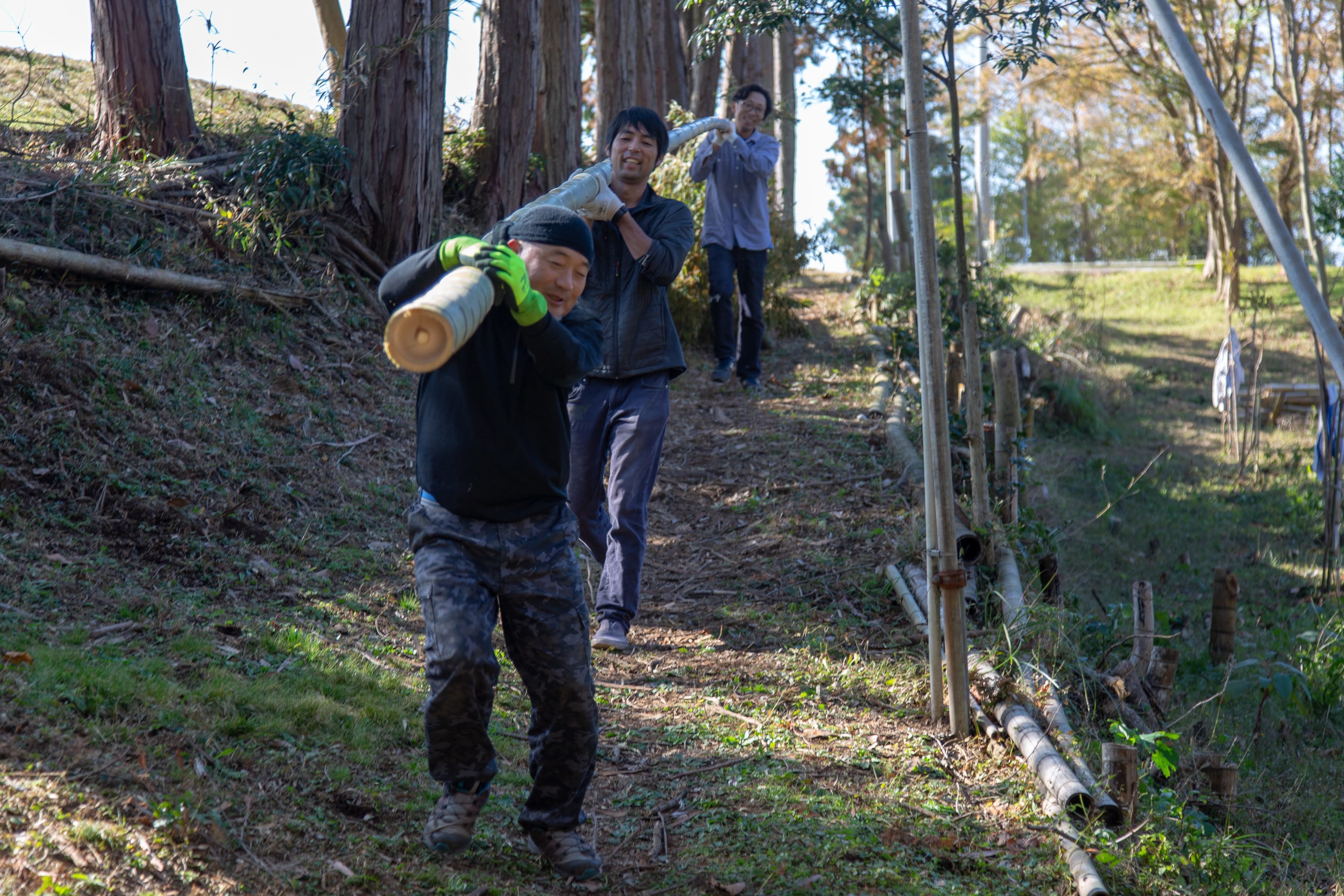 間伐用の竹を切り出しジャングルジム製作。イベント終了後、竹炭として循環されました。