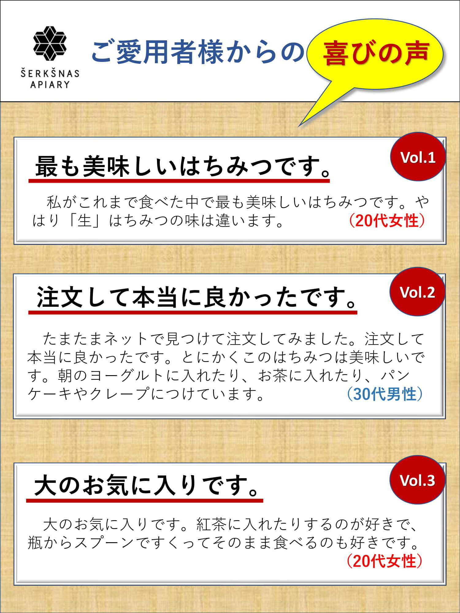 シェルクシュナス養蜂場では、今回ご紹介のナッツ入り高級「生」はちみつの他、プレーン、フリーズドライのフルーツやハーブが入っている「生」はちみつなど、10数種類の商品を取り揃えています。それらの商品を愛用してくださった方々の声を紹介致します。