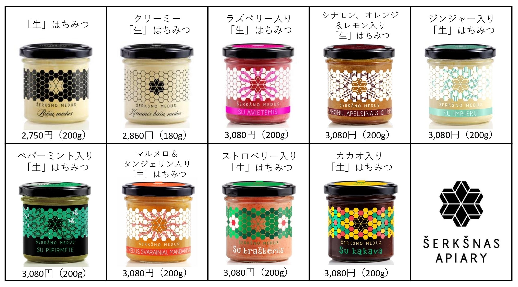 ※今回のプロジェクトで紹介しているナッツ入り高級「生」はちみつ(380g、190g)の2種類と下記の9種類の合計:11種類の中からお好きな商品をお選び頂けます。
