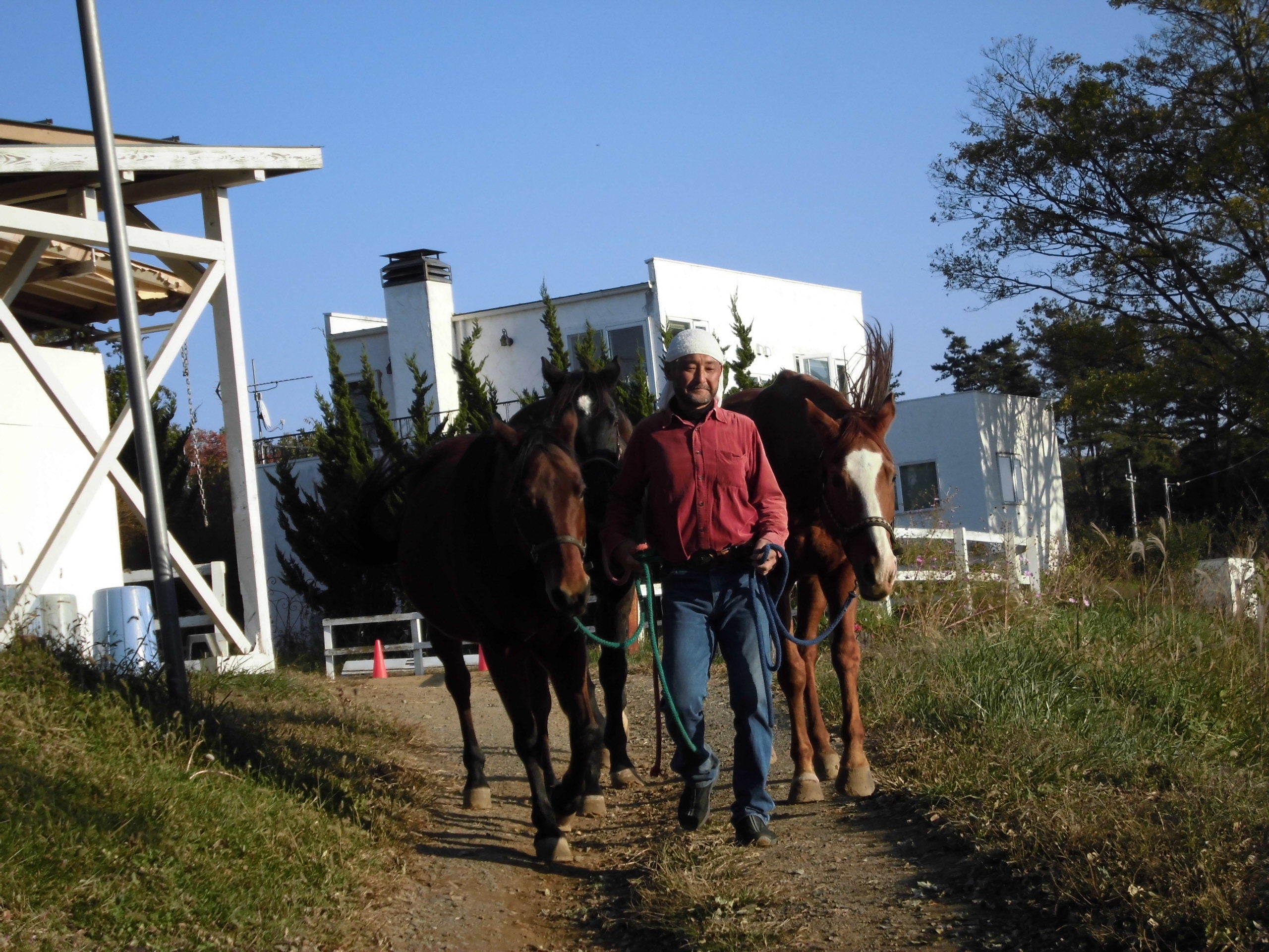 <馬たちとの毎日:朝、放牧場に移し、夕方、厩舎に戻します>