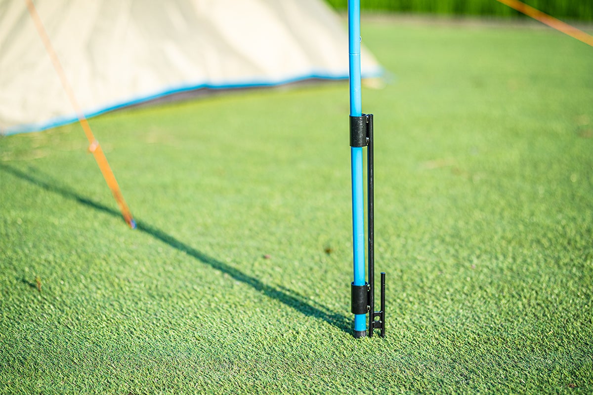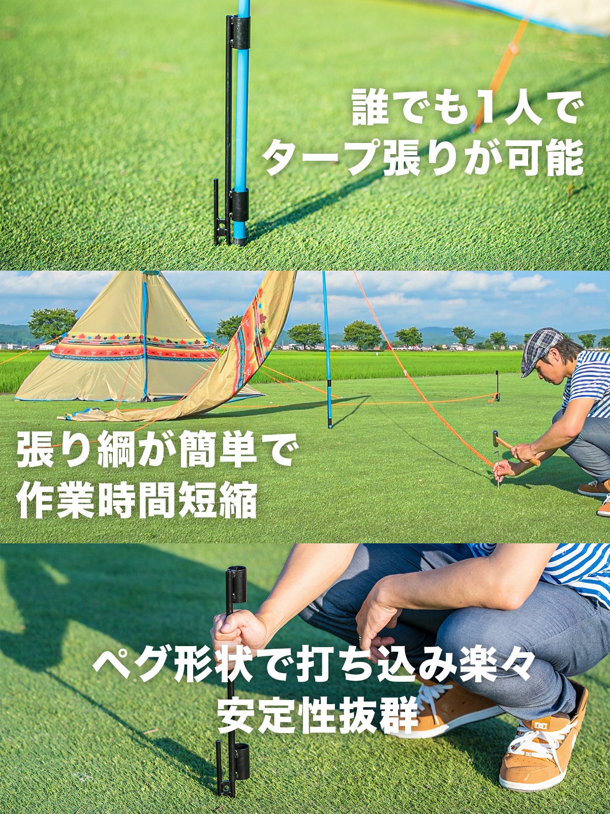 ポールが常に安定しているので、タープの張り綱作業が楽に行えます。ペグを打ち込む場所の変更も簡単に行えます。
