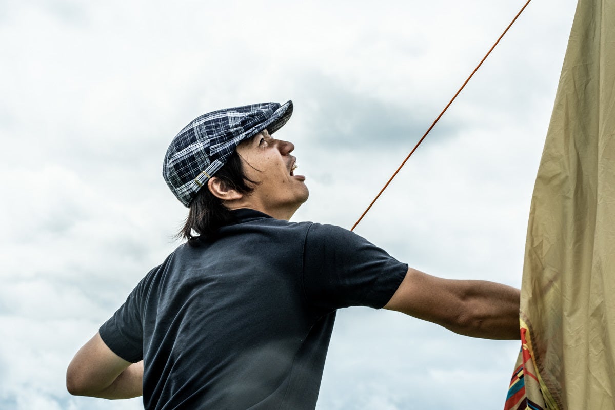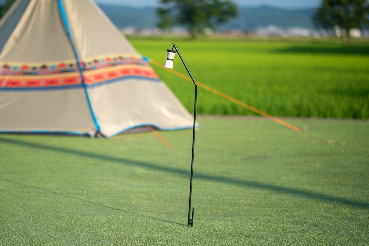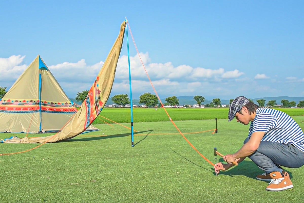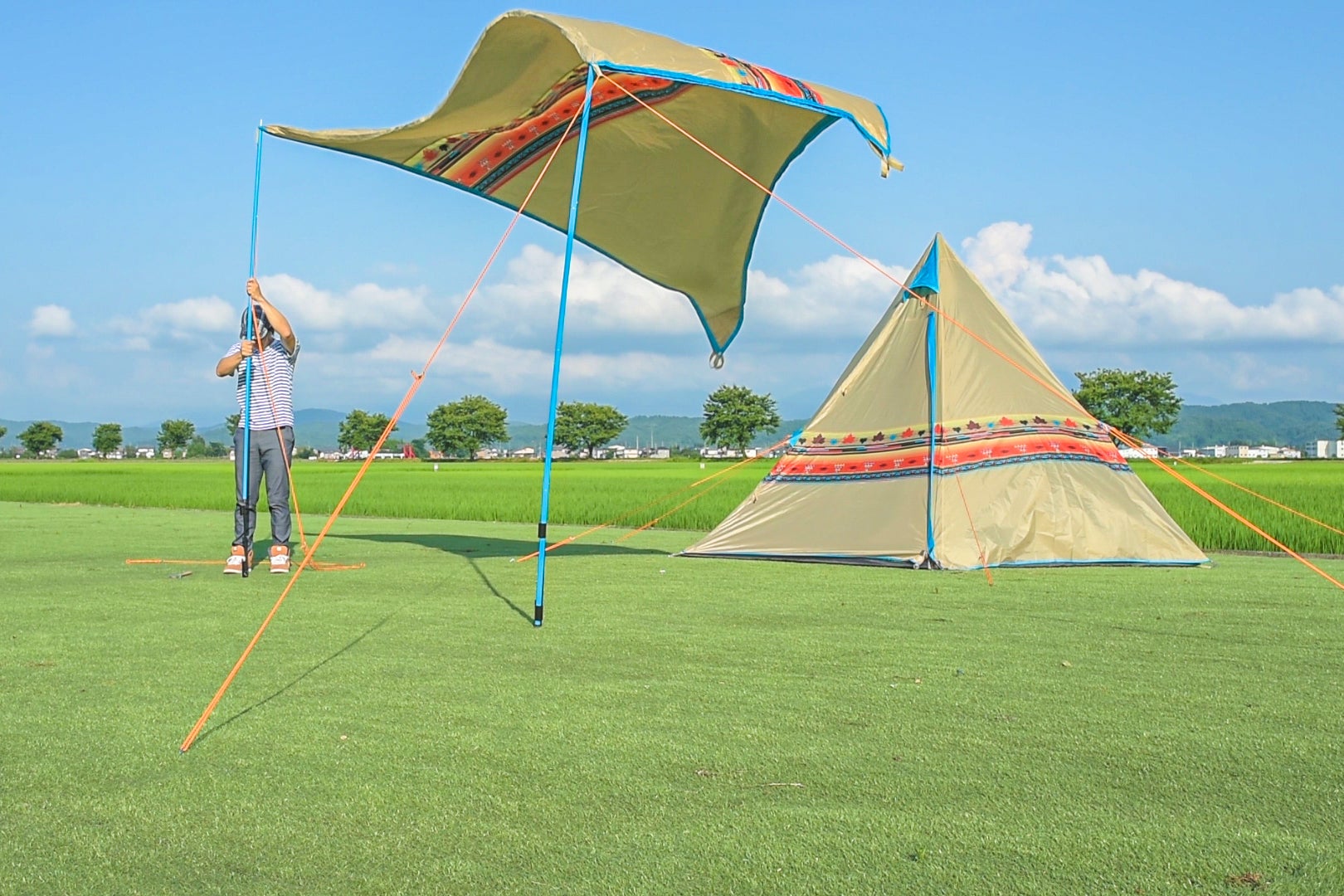 タープを張るときに風が吹いていると、1人での作業は困難ですが、タープヘルパーがあればポールを支えてくれるため、安全に設営が行えます。多少風が吹いても恐るるにたりません。