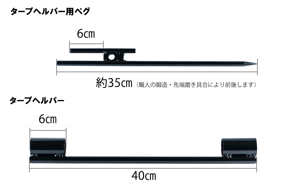 サイズ:タープヘルパー(約W3.4㎝×D4.8㎝×H40㎝)Uペグ(約W0.9㎝×D3.5㎝×H35㎝)タープヘルパーとUペグ装着時長さ(約67㎝)