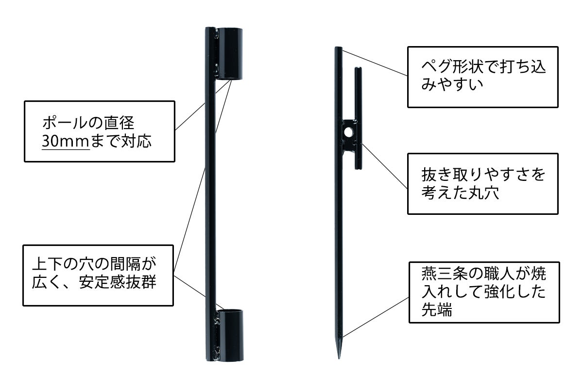 「Uペグ(タープヘルパー用ペグ)」と、「タープヘルパー」のふたつを合体させることにより、ポールの安定性を高めます。そしてふたつに分解できるので片付けがラクラク!収納もコンパクト!