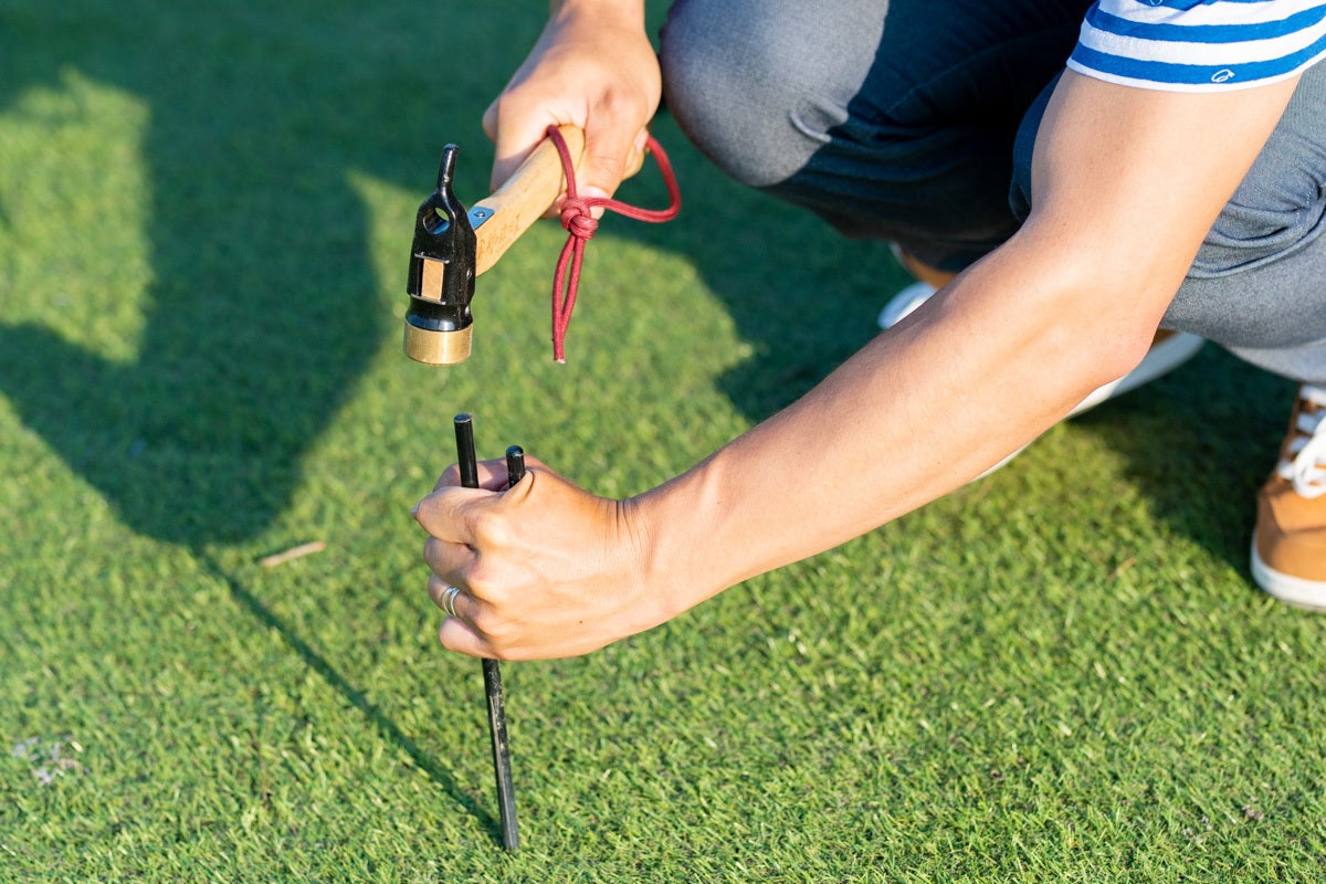 ペグ形状なので、簡単にハンマーで打ち込むことが出来ます。また、タープヘルパーには、ハンマーを引っ掛けて抜くことが出来る丸穴があるため、片付けが楽に行えます。