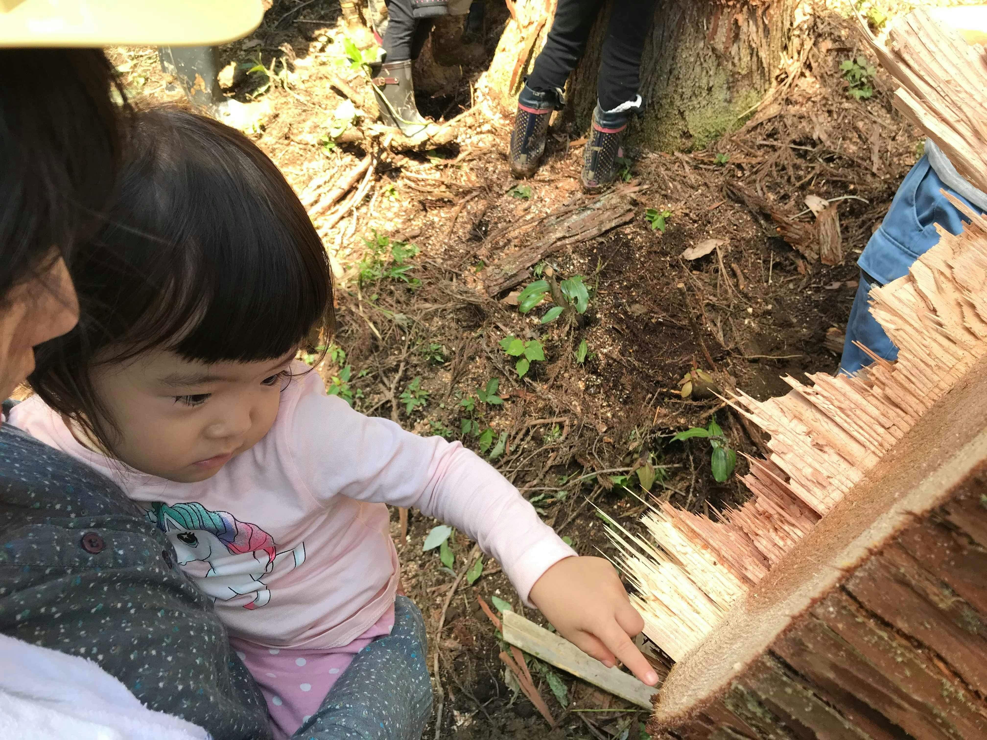 ずっと抱っこで離れなかった娘も、木の皮めくりに夢中になりました。