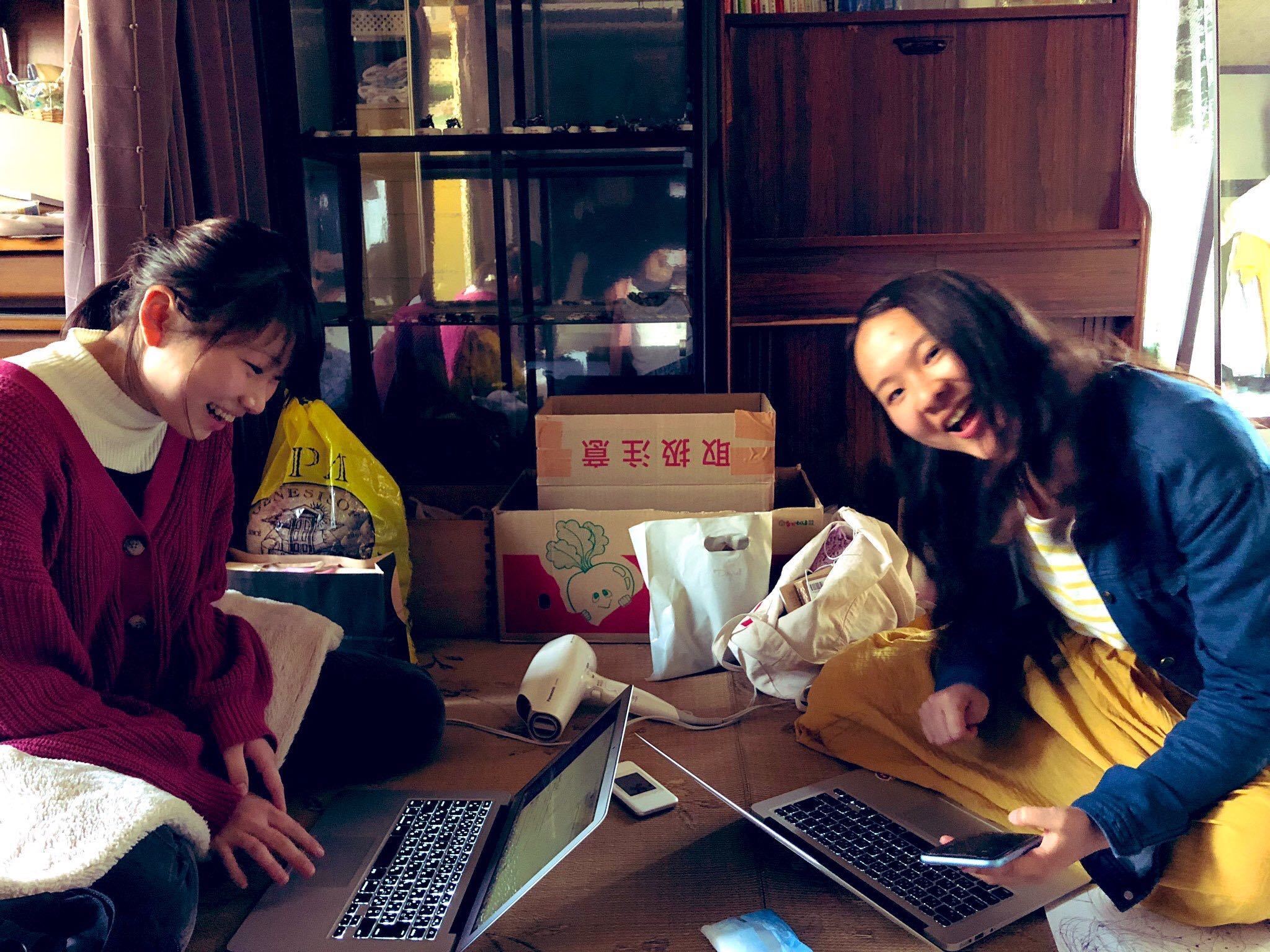 写真左から、なっちゃん(石井夏海)たまちゃん(笹木珠代)。週に一度のアカリノ会議の様子です。
