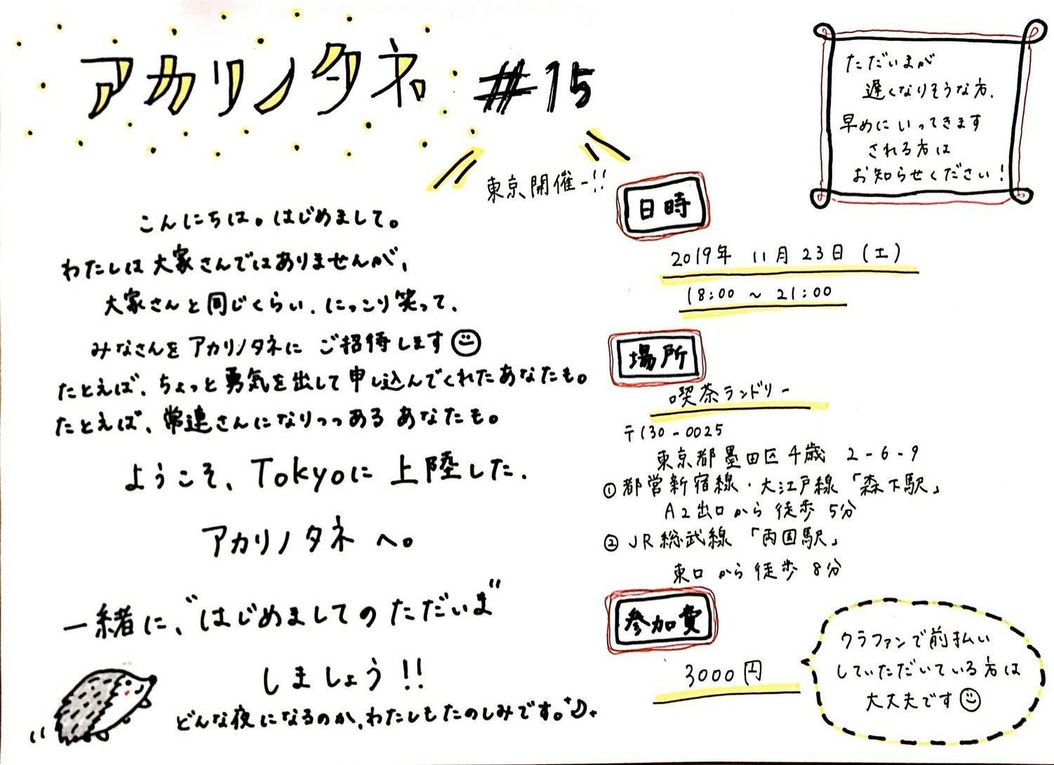 皆さまのご支援のおかげで、ついに今週末、『アカリノタネin東京』を開催しに東京に行ってきます…!