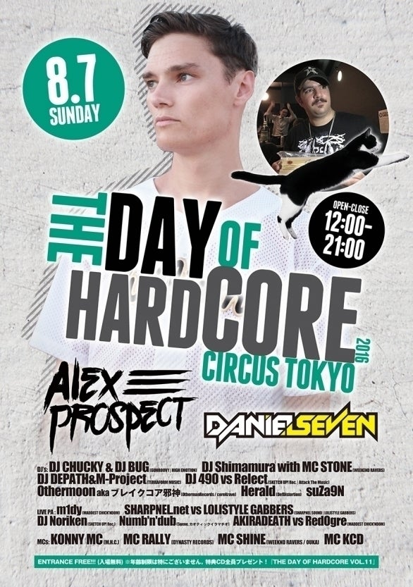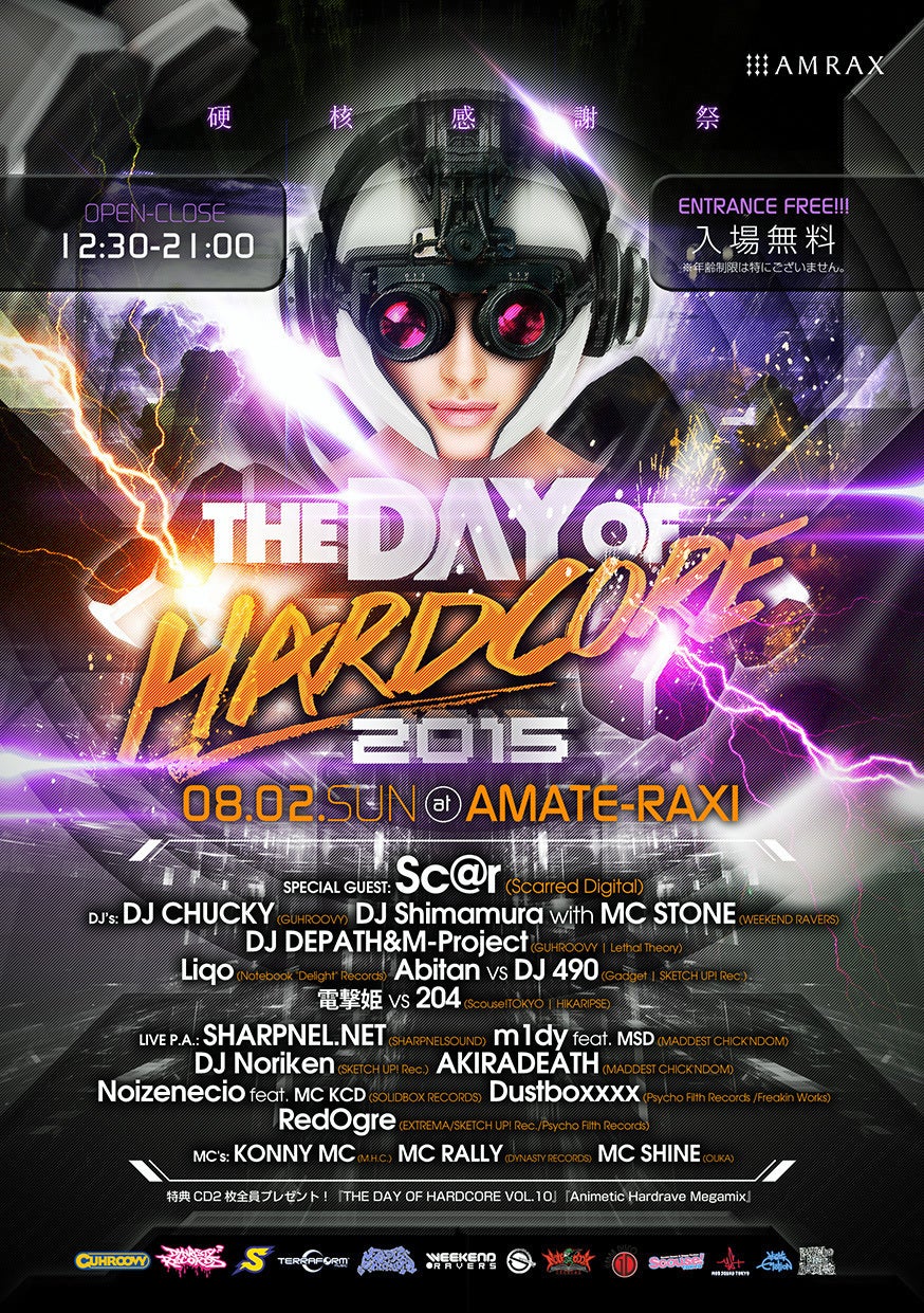 2006年に「THE DAY OF HARDCORE」立ち上げ。2008年よりフリーパーティーとして渋谷amate-raxi(現在はCIRCUS Tokyo)にて11回開催。毎年500人を超える人に遊びに来て貰っています。