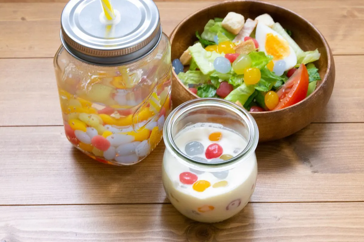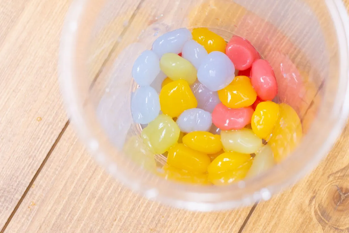こんにゃくなので煮出す必要もなく、すぐに使えます。タピオカのように黒糖や白糖で煮出して甘みをつけてもOKですし、サラダやヨーグルト、アイスクリームなどにも合います。また、こんにゃくなのでホットでも溶けずに使えます。天然着色料で優しく着色しているので無害ですし、見た目もカラフルな大きめのφ10mm玉。特許第3905830号(こんにゃくはアルカリ性食材なので酸性にする特許素材を使用)。日本製。
