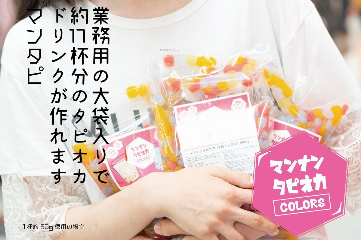 ・マンナンタピオカ(4色ミックス) 500g:タピオカドリンク約17杯分のたっぷりマンナンタピオカ入り(一杯約30gとして)の業務用でも使える大袋仕様です。通常販売価格:2,500円(税別)なので、1杯あたり約150円弱でタピオカドリンクが楽しめます。