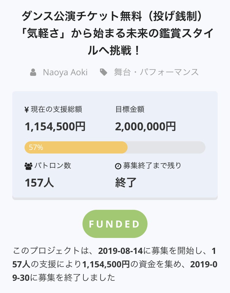 2019/09/29 16:04みなさまへご報告です。僕らの挑戦も残すところあと2日となりました。「ダンス公演チケット無料(投げ銭制)「気軽さ」から始まる未来の鑑賞スタイルへ挑戦!」https://camp-fire.jp/projects/view/180263支援者数は100を越えましたが、金額は50%に満たずです。このままいくと、100%は難しい状態で、「そうしたらどうなるの?」と思う方がいらっしゃると思います。少し気が早いですが100%行かなかった場合についてご報告いたします。・all in方式での挑戦です・支援金額は僕の手元に入ります・3月の集成公演は予定通りの日程で行います。(5~7公演)・集まった金額を元に、そのうちの数回をチケット無料公演にしたいと考えています。普通に無料にするだけでは、他の有料公演のチケットが売れなかったり、無料にしても人が集まらない可能性も考えています。また、これまで応援していただいた観客のみなさま、今回のご支援いただいた方々への感謝とリスペクトを忘れず考えなければいけません。根源であるプロジェクトのテーマ「気軽に」を念頭に置き、新しい観客層開拓、公演スタイルの模索検討し、実施方法をさらに詰めてご報告させていただきます。最後に、これまで何度かお伝えしてきましたが、キャンプファイヤー社の取り決めから、プロジェクト終了の30日を過ぎるまでご支援いただいた方のメールアドレス、お名前はわからない状態です。・キャンプファイヤー社の会員登録をされている方(ログインした方)でユーザーネームに心当たりのある方・プログラム掲載のためのお名前を備考欄に記入いただいた方上記に当てはまらない方のご支援は、現在どなたかわかりません。一体100名を越えるどなたが、こんなにも応援してくれているのだろうか?それを知れるのは10月1日以降になります。本当に感謝をしております。。。リターンの時期はそれぞれですが、まずは「青木尚哉のサンキューメール」を早速送らせていただくのを今から楽しみにしております!!あともう数10時間の挑戦ですが、最後までどうぞよろしくお願い申し上げます!!青木尚哉#ダンス#ダンス公演#青木尚哉#青木尚哉グループワークプロジェクト#CAMPFIRE#クラウドファンディング もっと見る