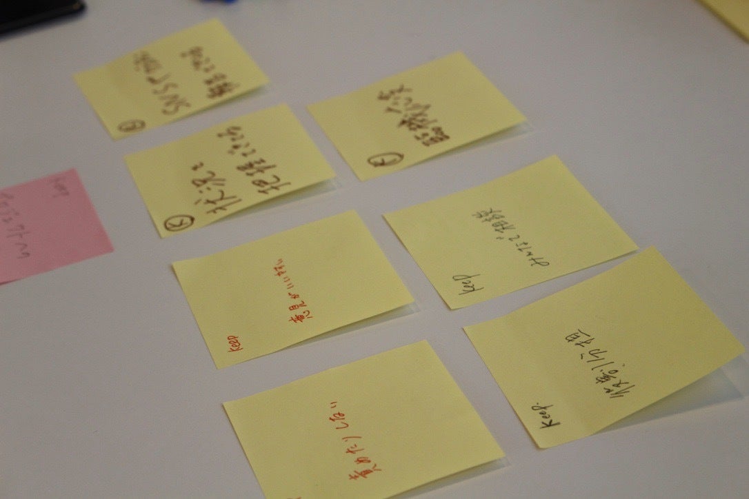 KPT(Keep Problem Try)という手法を用いて今までの活動の振り返りを行いました。メンバーがそれぞれの付箋にkeep、problem、tryを書いたあと、みんなで共有をしました。