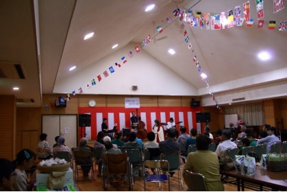ライブ当日(9/22)は、台風17号が山口県に接近。急遽会場を須金支所(公民館)の多目的ホールに変更しての開催となりました。当会場は、翌々日の大津島との交流会を控えて準備が整えられており、紅白幕や、万国旗が揺れる下での演奏となりました。