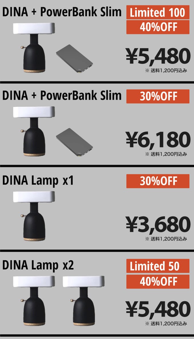 DINA Lampの駆動にも使える、便利なモバイルバッテリーをセットしたお得なコースも用意しました。もちろんお手持ちのスマートフォンなども充電していただけます!