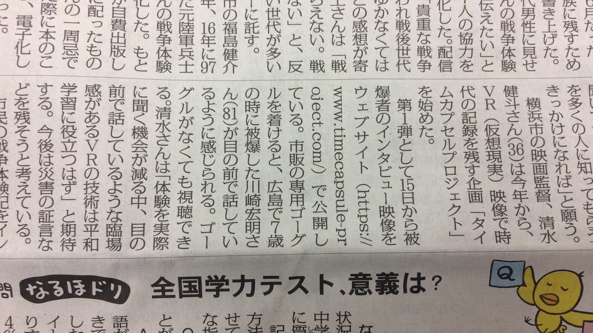 本日の毎日新聞全国版の朝刊にタイムカプセルプロジェクトが掲載されました!