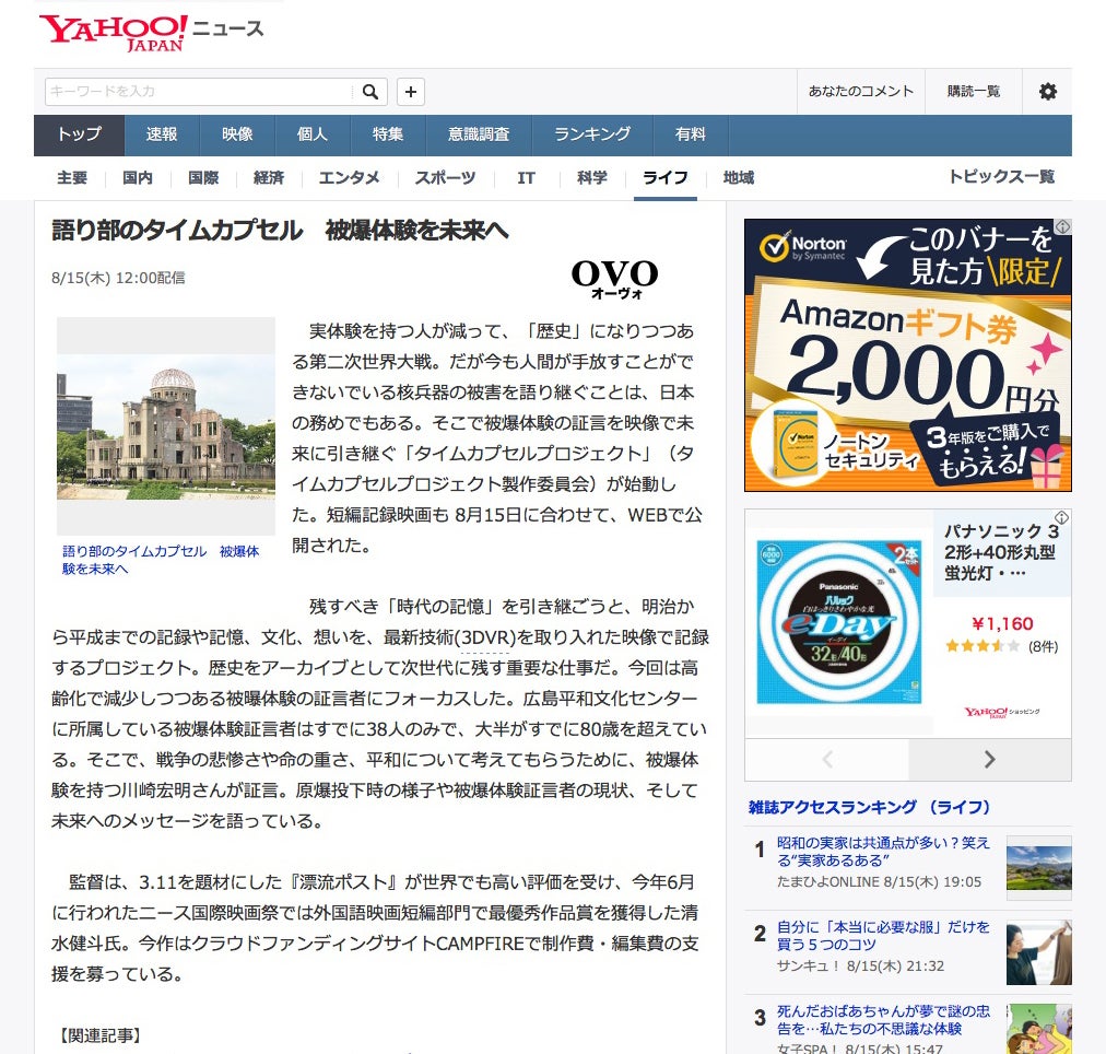 共同通信運営のOVOにプロジェクトの事を取り上げていただき、ついにyahooニュースに掲載されました!このプロジェクトがさらに広まり認知される事で、単なるドキュメンタリーではなく、教育や学校の道徳の授業などでも扱ってもらえるようになればいいなと考えています。まだまだファンディングは続きますので、引き続き応援のほど宜しくお願いします。HPhttps://www.timecapsule-project.com