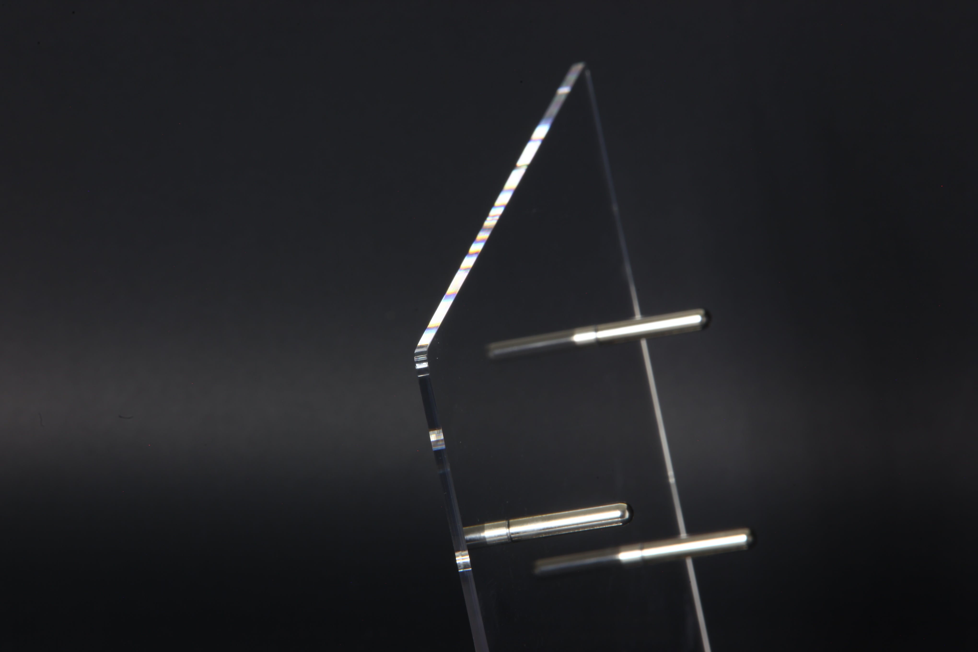 ペンライトスタンドは板厚3mmの透明アクリルとメッキピンを使用することでインテリアとしても違和感のない、美しい仕上がりとなっております。