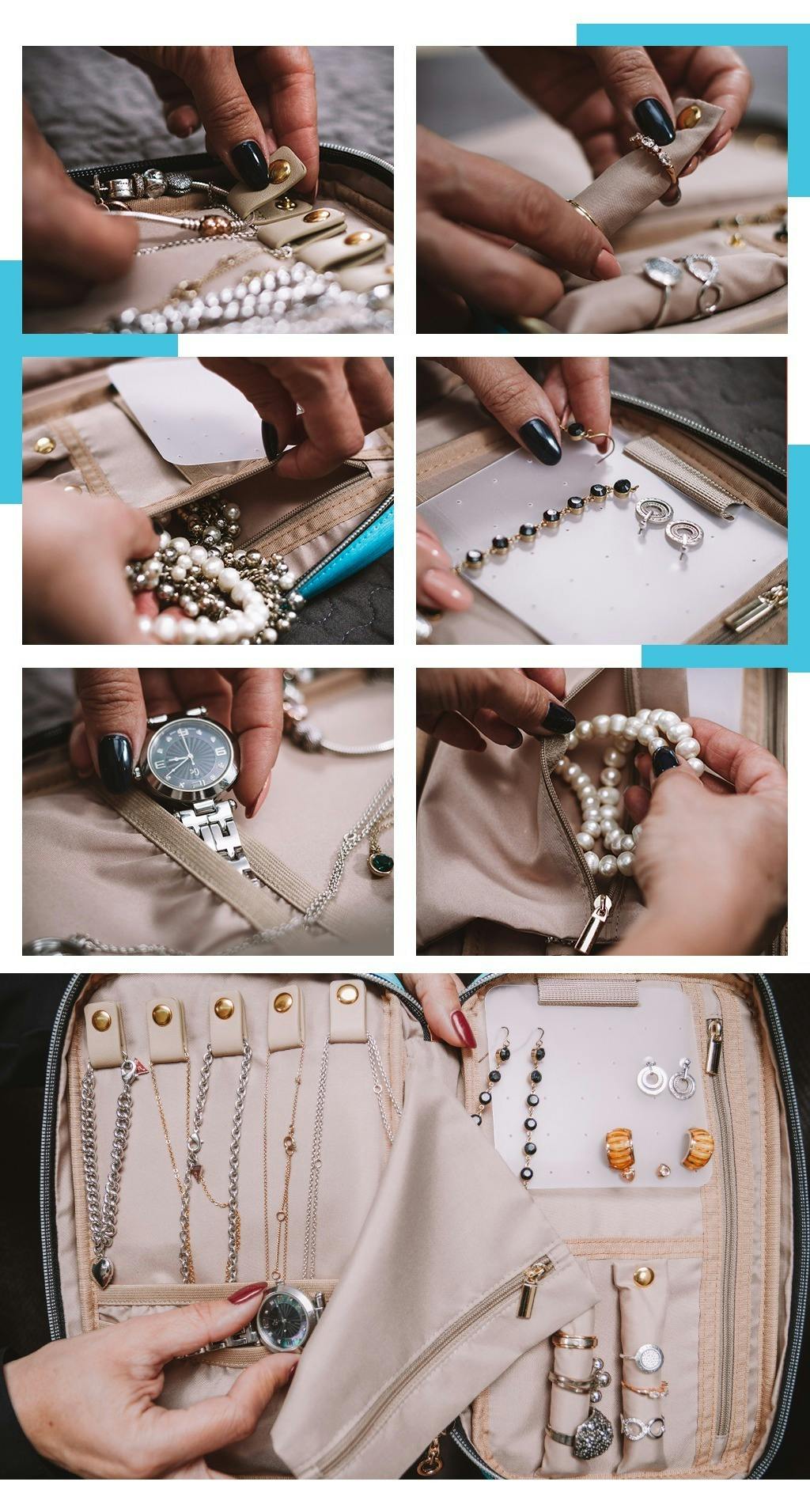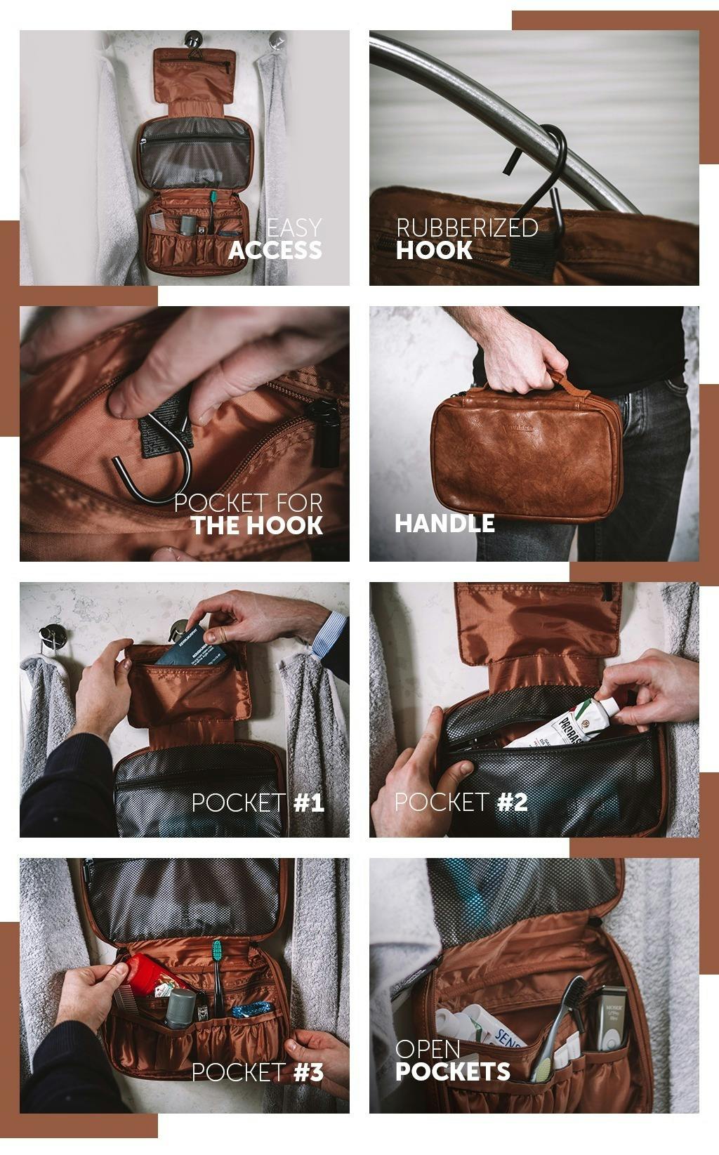 バッグ内にあるフックを使用すると小さなバスルームでもパーソナルケア製品を置くスペースを確保できます。