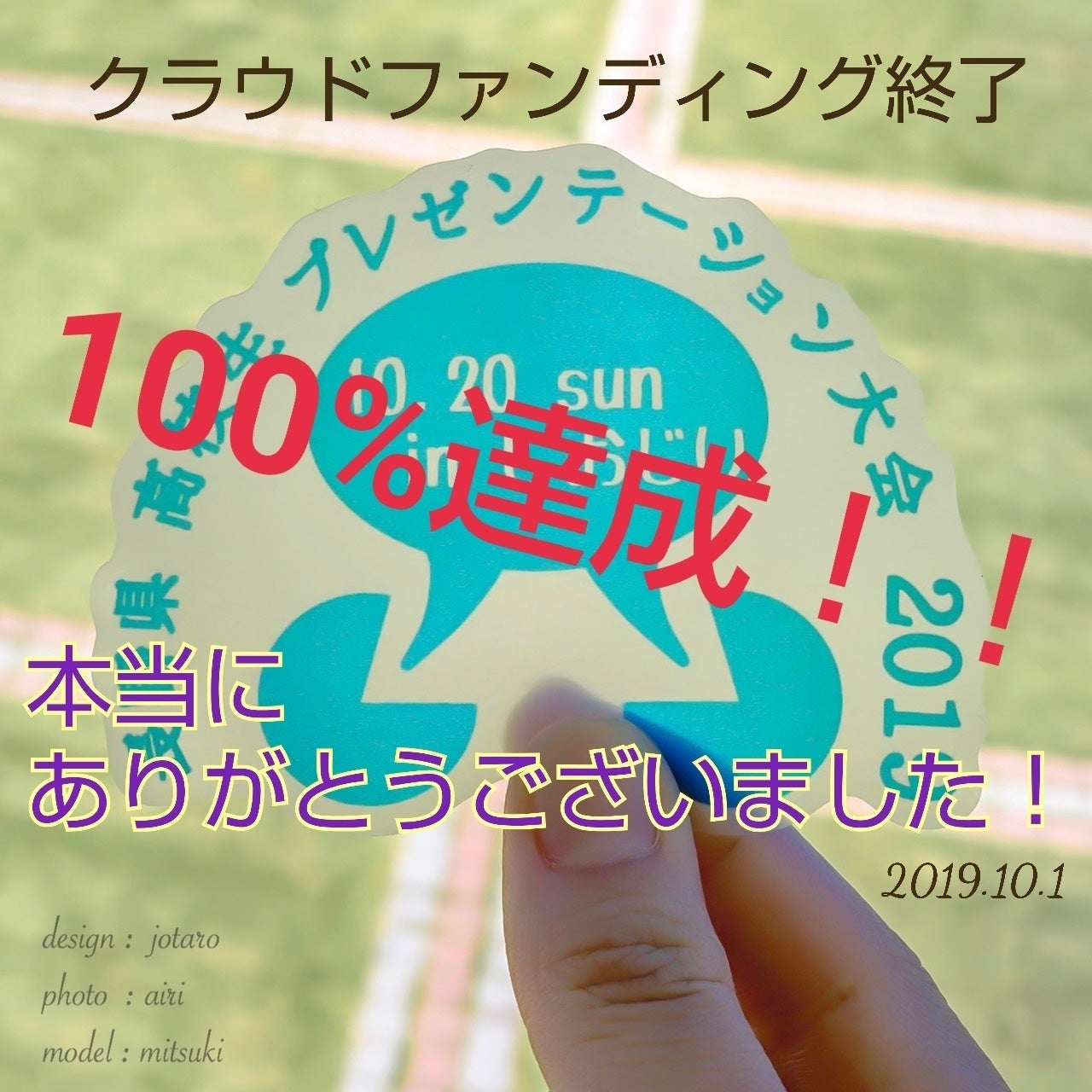 2019/10/01 06:30おはようございます!昨日でクラウドファンディングが終了しました!なんとなんと、100%達成しました!やったー!!!!!!あと一時間じゃ、さすがに厳しいかな...と思っていましたが、またも優しいパトロンのみなさまの力によって、見事100%達成しました!本当にありがとうございました!リターン品は、順番に発送させていただきます!もちろん、心からの感謝を込めて、書かせていただきます!!クラウドファンディングは終了しましたが、本番は10/20です!ご都合の良い方は、会場へ足を運んでください!お待ちしています! もっと見る本当に最後!