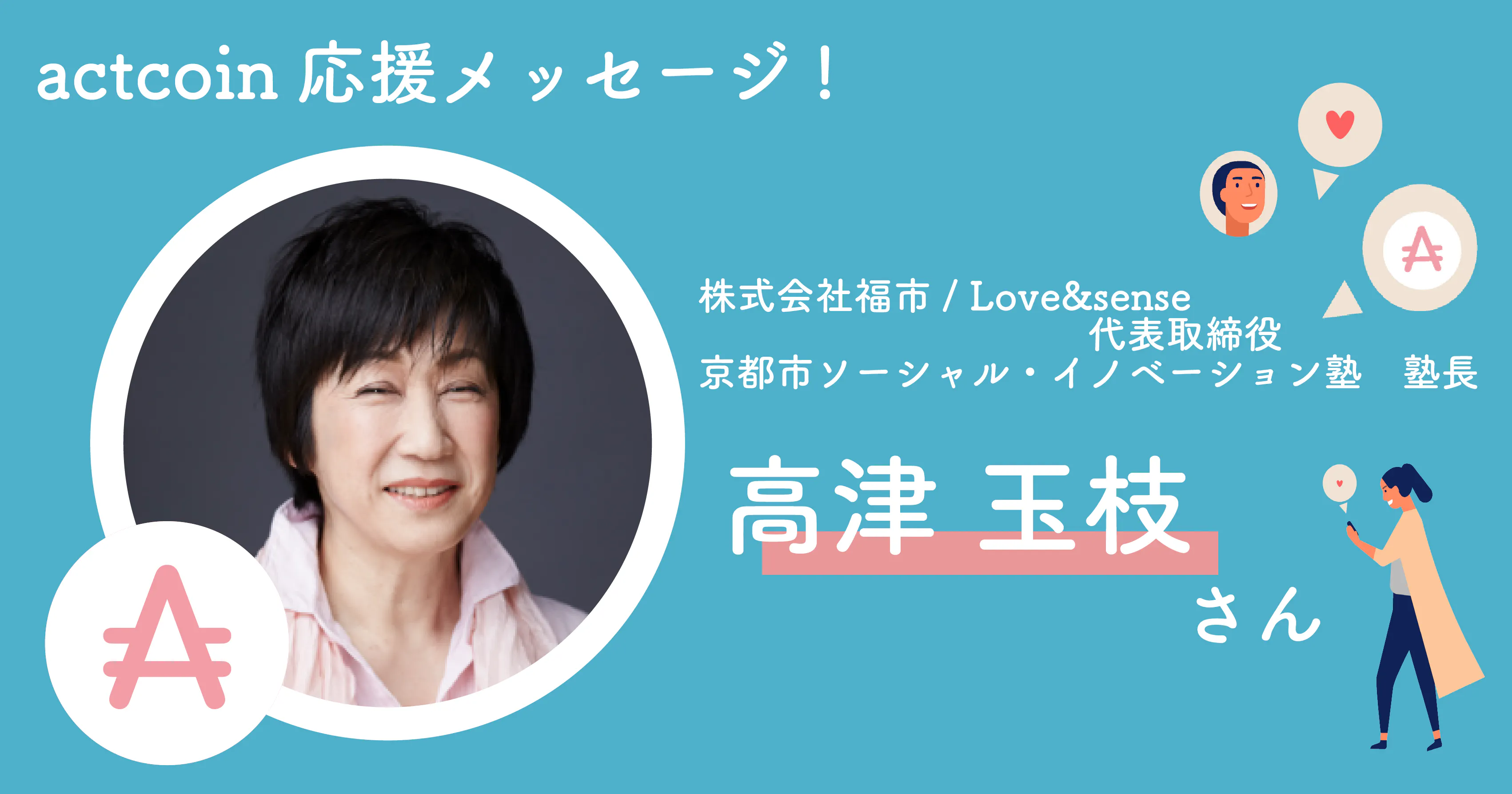 株式会社福市/Love&sense 代表取締役、そして京都市ソーシャル・イノベーション塾の塾長を務められている高津玉枝さんから、actcoinへの応援メッセージをいただきました!
