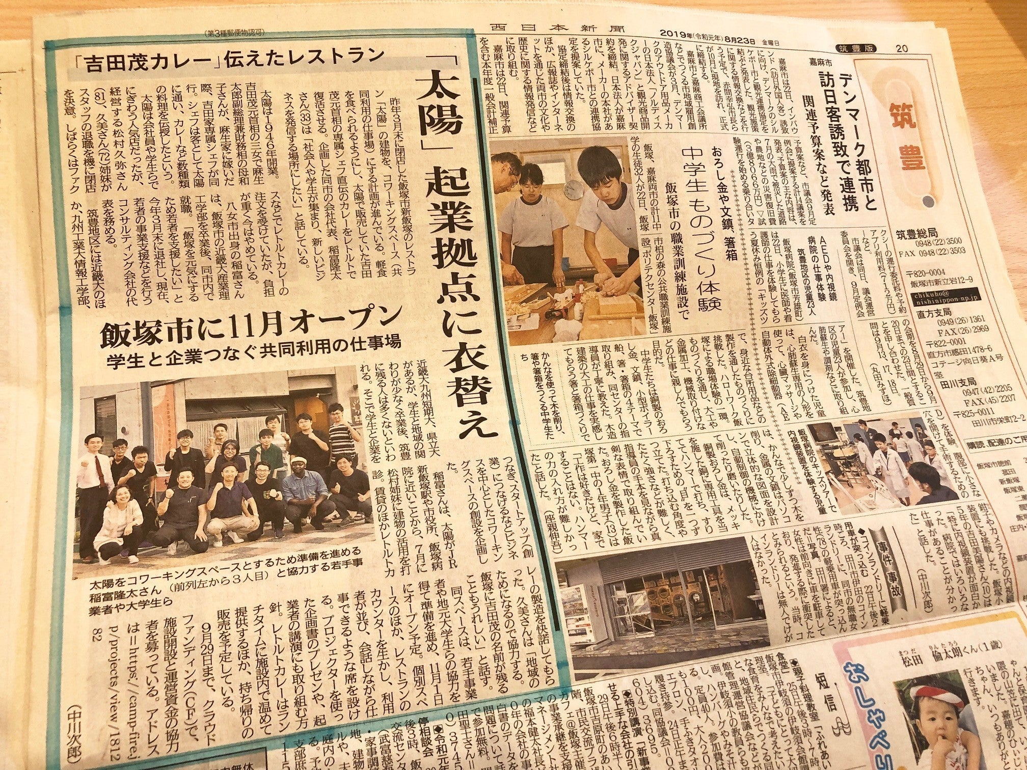 2019年9月23日西日本新聞筑豊版に『Co-WorkingCafe太陽』の新たな活動を取り上げて頂きました!!