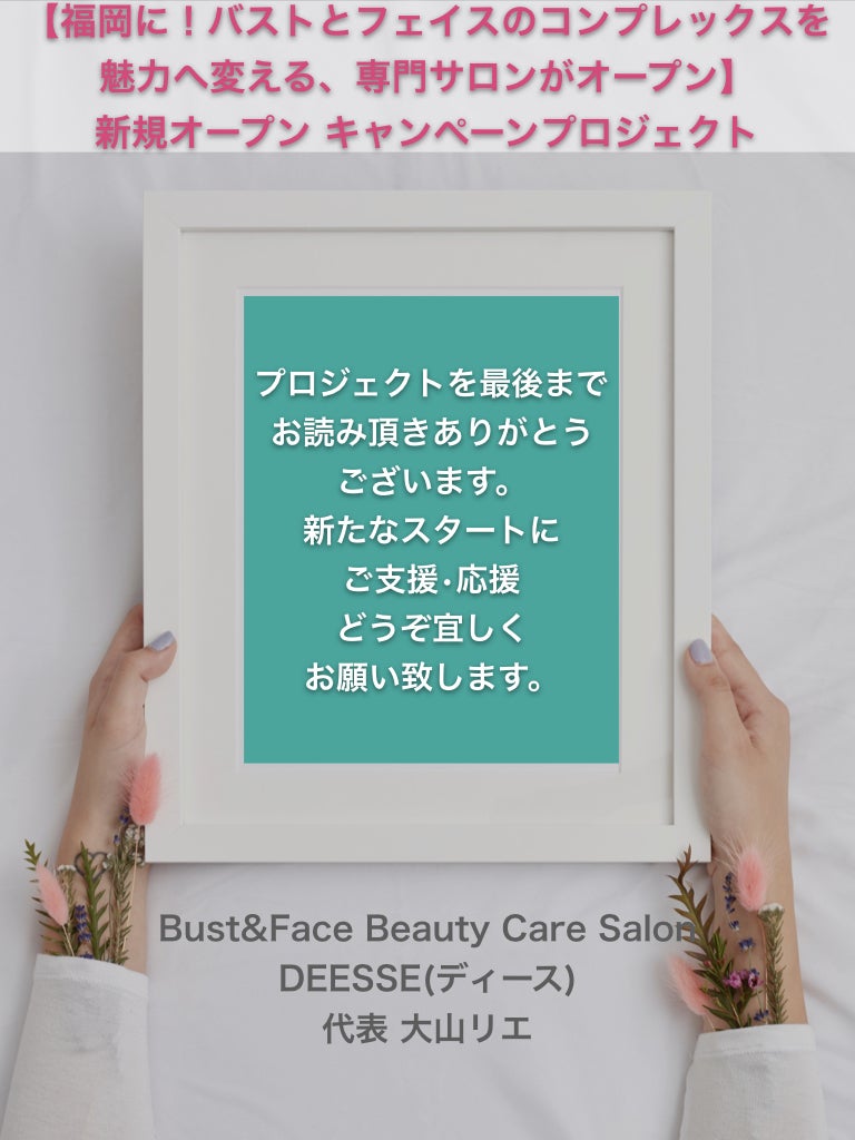 2019/10/30 17:00皆さまこんにちは。9/27〜10/29まで、募集させて頂きましたクラウドファンディング 【福岡初上陸!バストとフェイスのコンプレックスを魅力へ変える専用サロンがオープン!】〜大人の女性の2大悩みを解消するプロジェクト〜ご支援金額 456,600円パトロン 46人達成率 91%皆様の温かい応援とご支援により無事にプロジェクトを終了する事ができました事、心より感謝申し上げます。目標金額に達しませんでしたが、私良く頑張ったと褒めてあげたいです!日中仕事しながらのチャレンジだったので、時間も限られていた中、直接ご案内に行けなかった方もたくさんいましたが、1ヶ月間私の投稿や告知にお付き合い頂き本当にありがとうございました。初めての事だらけのクラウドファンディング で、ワクワクもありましたが、今だから白状しますが、内心不安な気持ちの毎日でした←意外と小心者です。でも、ご支援者さまからの温かいメッセージや、会った時に「頑張って!」と言う言葉、支えてくださった方々からのメッセージ、言葉はなくても投稿にいいね!で応援してくださったり、それが支えで気持ちを強く持つ事ができました。終わった後は、色んな感情が込み上げてきて、恥ずかしいけど『一人で泣きましたよ!』溢れる感情は抑える事はできません‼︎クラウドファンディング に挑戦してみて感じた事はたくさんありますが、1番は「人は一人では何もできない」って事、そして「感謝」しかない事です。何かにチャレンジさせてもらえるって、本当に幸せな事なんだなぁと、改めて感じさせられた1ヶ月でした。何より、今回サロンオープンにあたりクラウドファンディング にチャレンジする運びとなったのは、私の所属する【アフェクティブバストセラピー協会代表 植田稀紀子さん】のご協力とご指導があったお陰です。まきさん♡素晴らしい景色を見させて頂いて、本当にありがとうございました!ちょっと感動的になってますが、今の気持ちを忘れたくなく皆さまにもこの気持ちを共有してもらいたかったので、長々と書かせて頂きました。私の次のステージの本番はこれからです!これから叶えたい事への想いを、たくさんの方に伝えていける様頑張っていきますので、こんな私ですが引き続きどうぞ応援宜しくお願い致します!そして応援の恩返しは、皆様のチャレンジを応援させてください!今後もこの応援ページを通して、サロンオープンまでの状況やオープン日などのご案内を投稿させて頂きますね。皆さま、本当にありがとうございます。Bust&Face BeautyCareSalon DEESSE 代表 大山 リエー深謝ー もっと見る