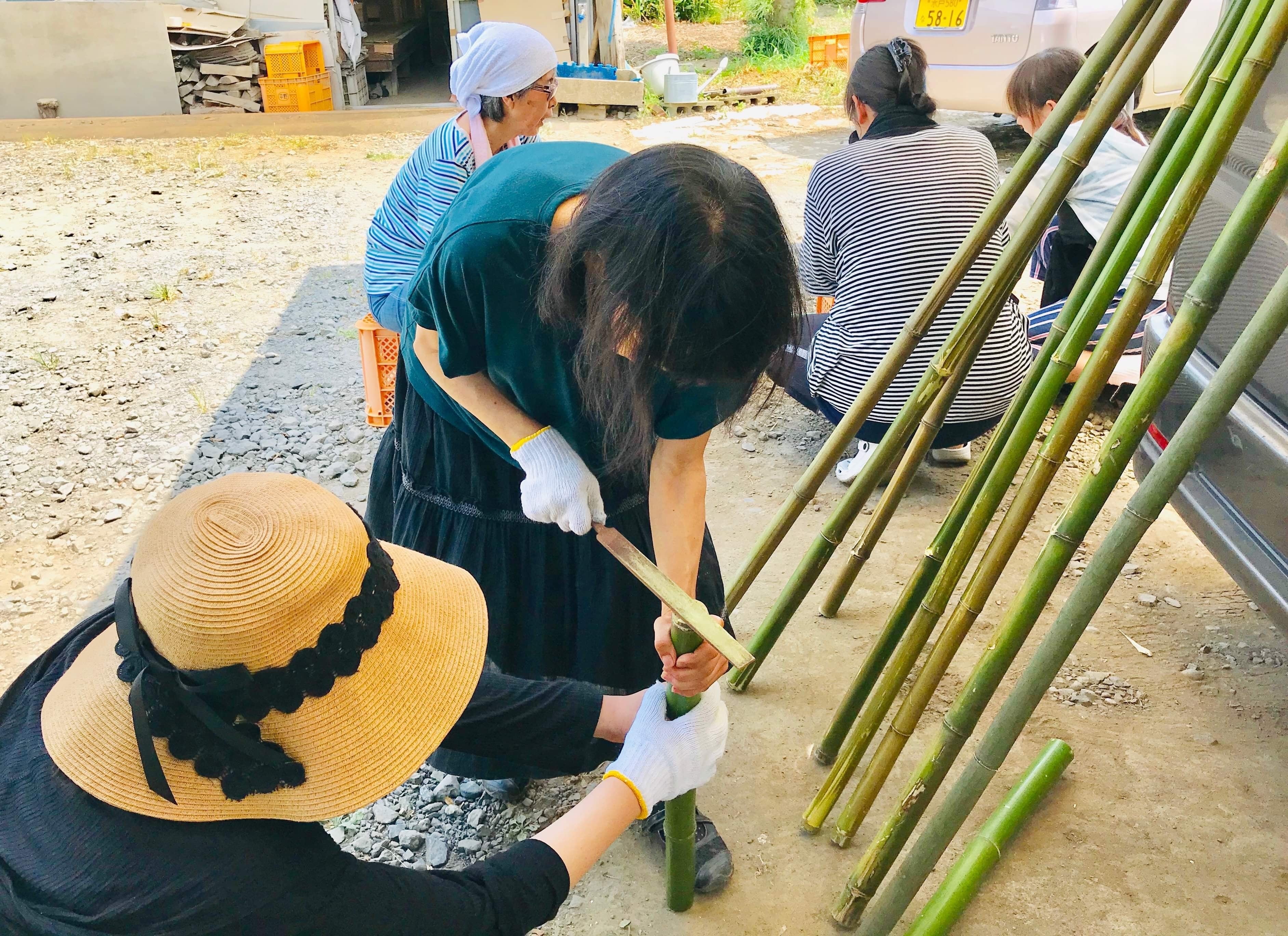 竹をノコギリで切り、ヤスリをかけてます。